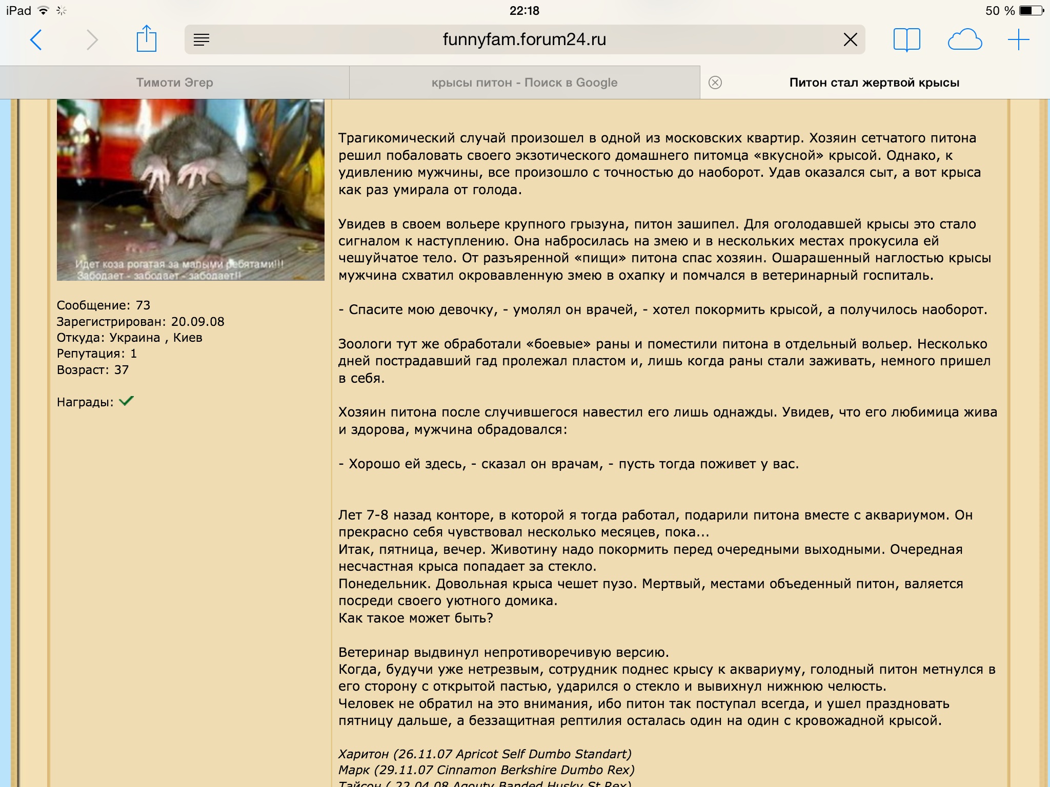Читал я эту клоунаду на 70 - и страницах и никак не могу понять, как удается хорошо содержать 50 крыс?