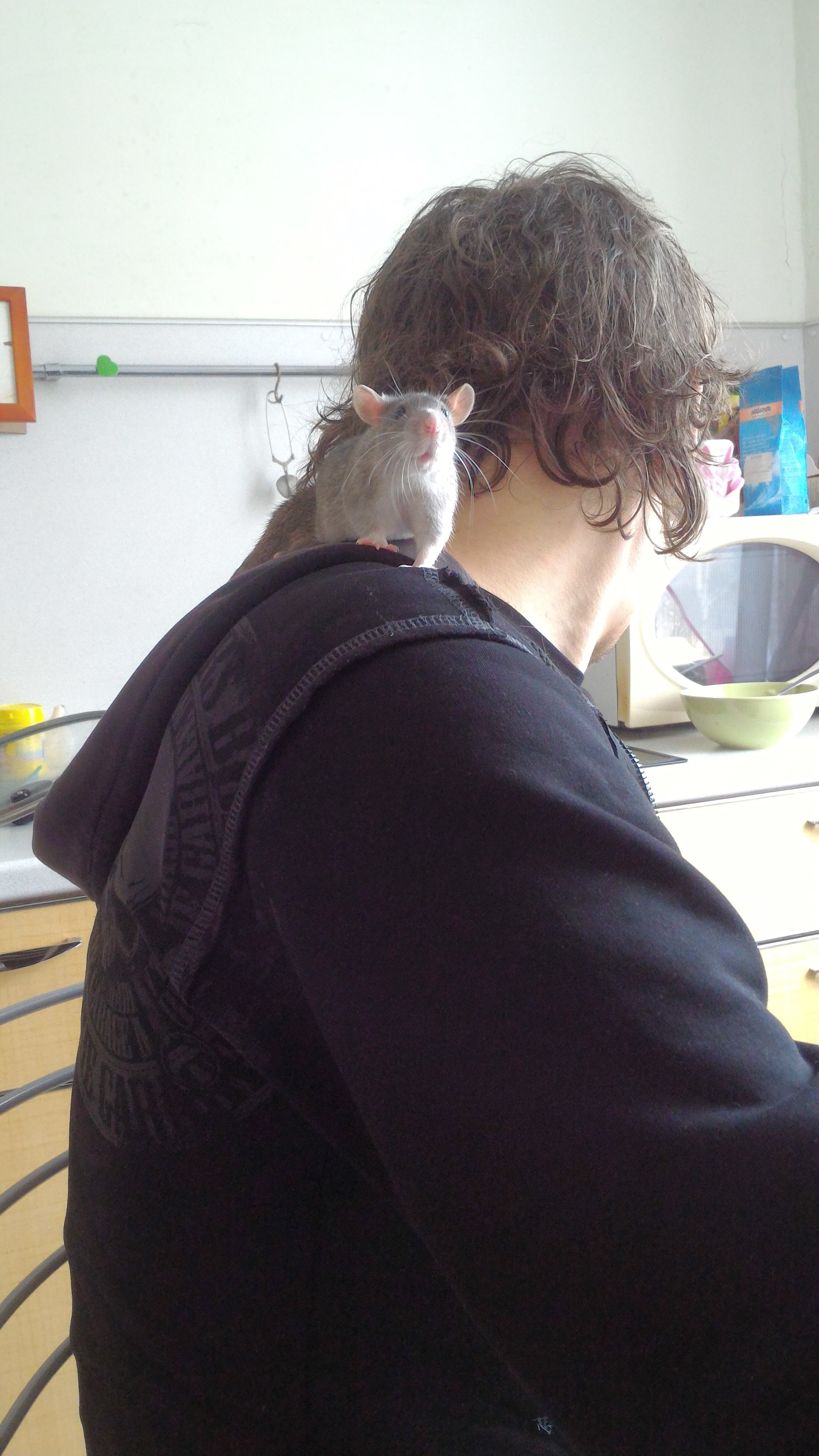 Пибоди более "ручной", он больше любит на муже сидеть, побегает немного и за пазуху лезет. А Пиксель турбовеник, ему надо все обежать, погрызть, залезть слезть, еще раз залезть, еще раз погрызть, проскакать галопом и по кругу)