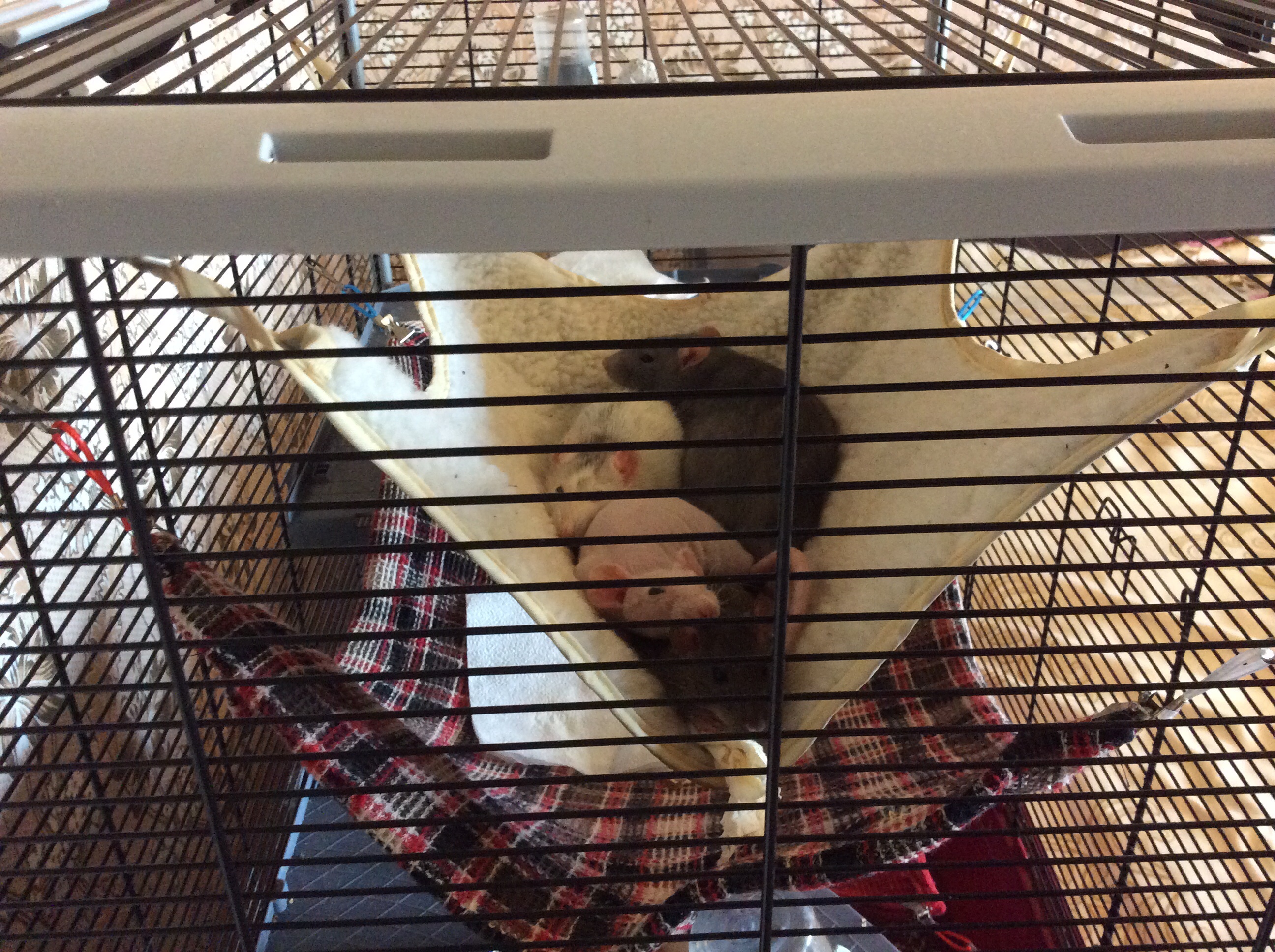 TinyLady, они в старой клетке живут, на трех замках. В новой дрались страшно, несмотря на то, что я туда еще четыре гамака повесила. Пересадила всех обратно на вторые сутки.