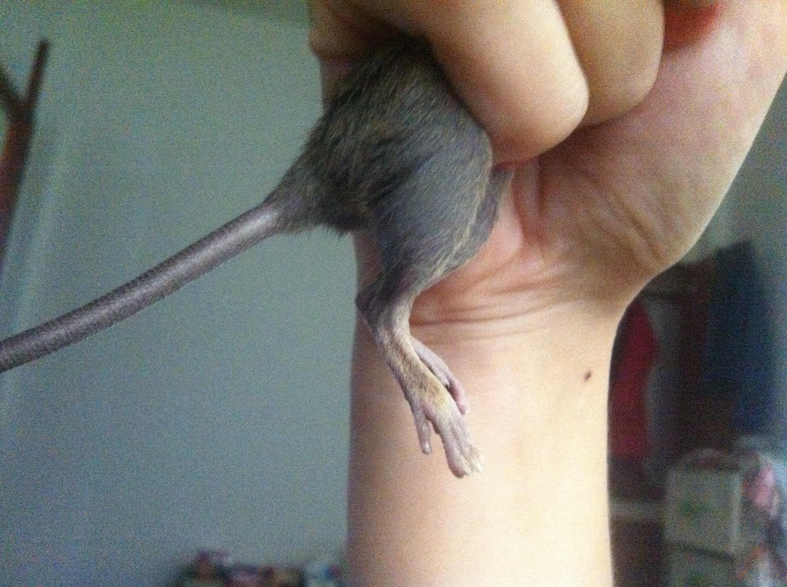 Кошка крыску принесла опять, танезумскую, совсем маленькую, девочку. Вот она бы точно приручилась до плюшевых целовашек, потому что совсем еще ребенок, тельце сантиметров 5-6. Но я ее отобрала уже мертвую... Я ей даже искусственное дыхание делала, от безысходности. Не могла смотреть, что такая приколюха - и умерла. Такая зайка!!! Лапость невероятная.... ;( Жалко так... Завтра похороню с моим крысиком рядом.