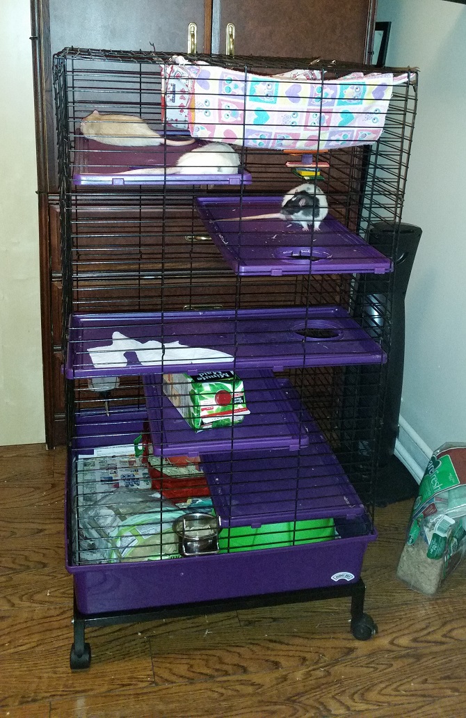 Приют обеспечил клеточкой побольше (60 × 60 × 105) + корм и гамаки: