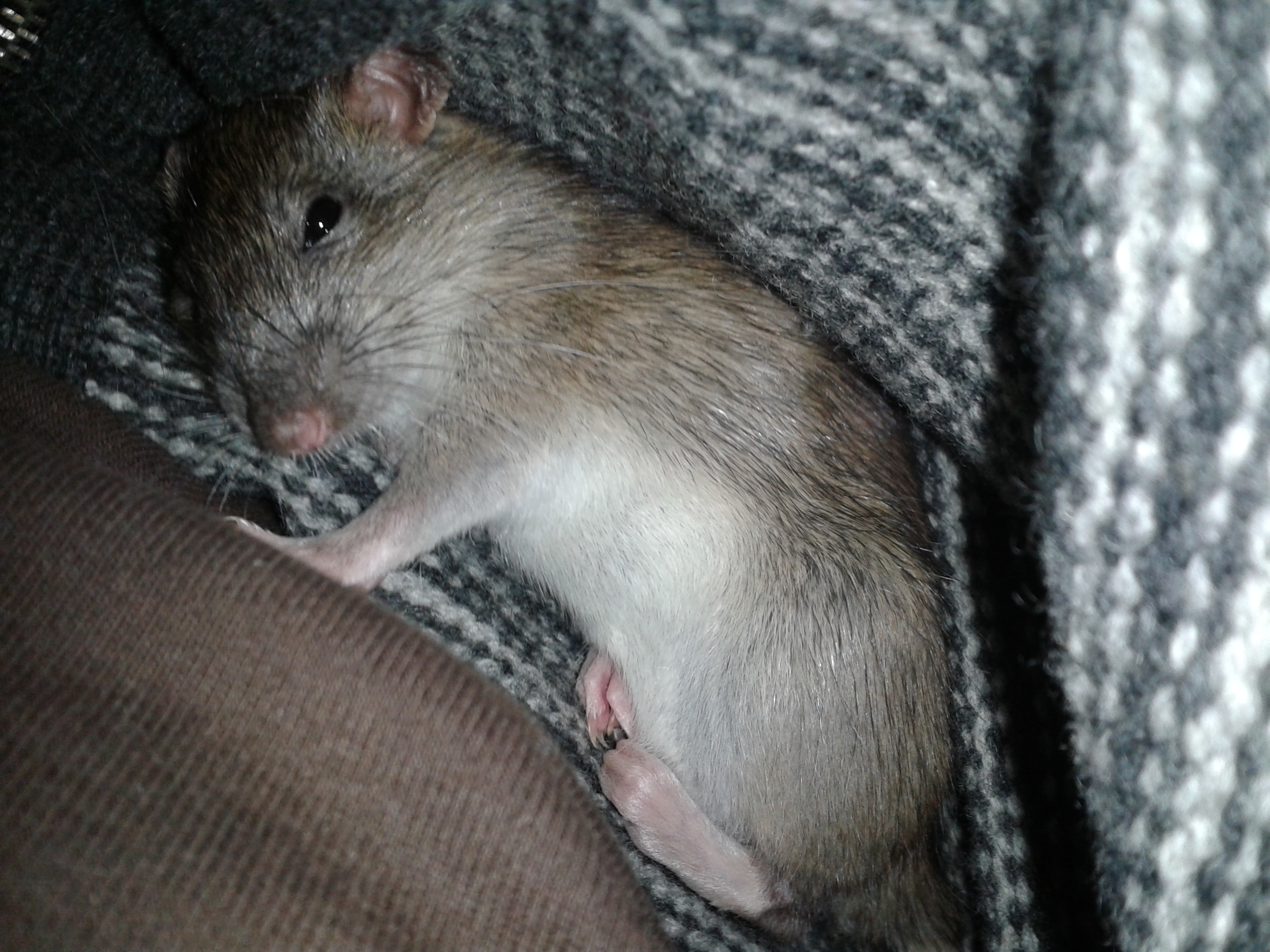 крысюк видимо решил, что без меня опасно. лижется и жмётся, в клетку приходитя его с трудом вытряхивать и быстро сбегать, иначе он в пару прыжков оказывается снова на мне. сейчас нашел мою ладонь, улёгся на неё и спит. такой умилительный и так его жалко.