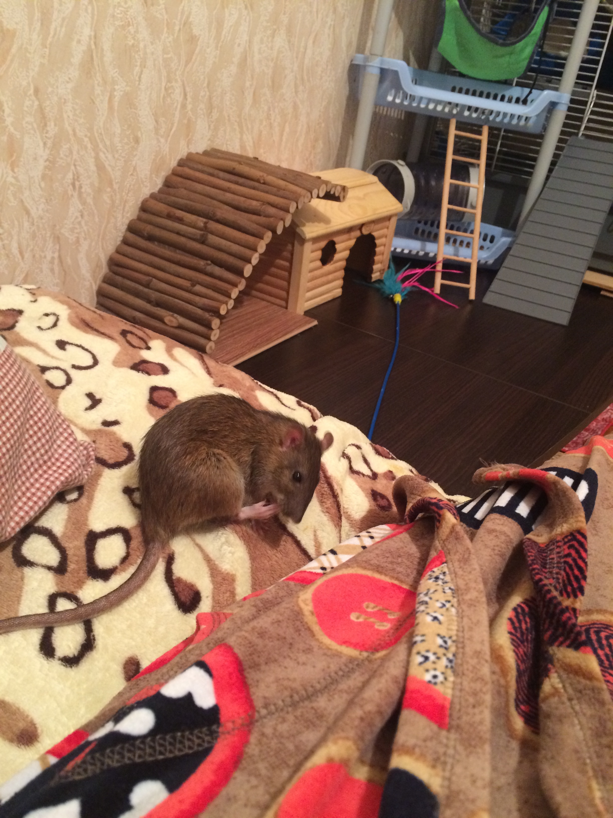 Сегодня с утра чуть инфаркт не получила: встала с кровати, а эта засранка возьми да и прыгни сзади на меня. Я её и не видела даже. А она промахнулась и вместо того, чтобы попасть на меня, оказалась на полу. И тут же нырнула под кровать. Ну, думаю, все, хана воскресному дню. Придётся до вечера моё пугливое Счастье оттуда выманивать. Позвала её, ни на что особо не надеясь. А эта невероятная крыса вдруг метнулась из под кровати к моим ногам и мгновенно вскарабкалась на меня. И как ни в чем не бывало начала мне щеку вылизывать! Я была в шоке и очень рада тому, что она наконец начала полностью мне доверять.
