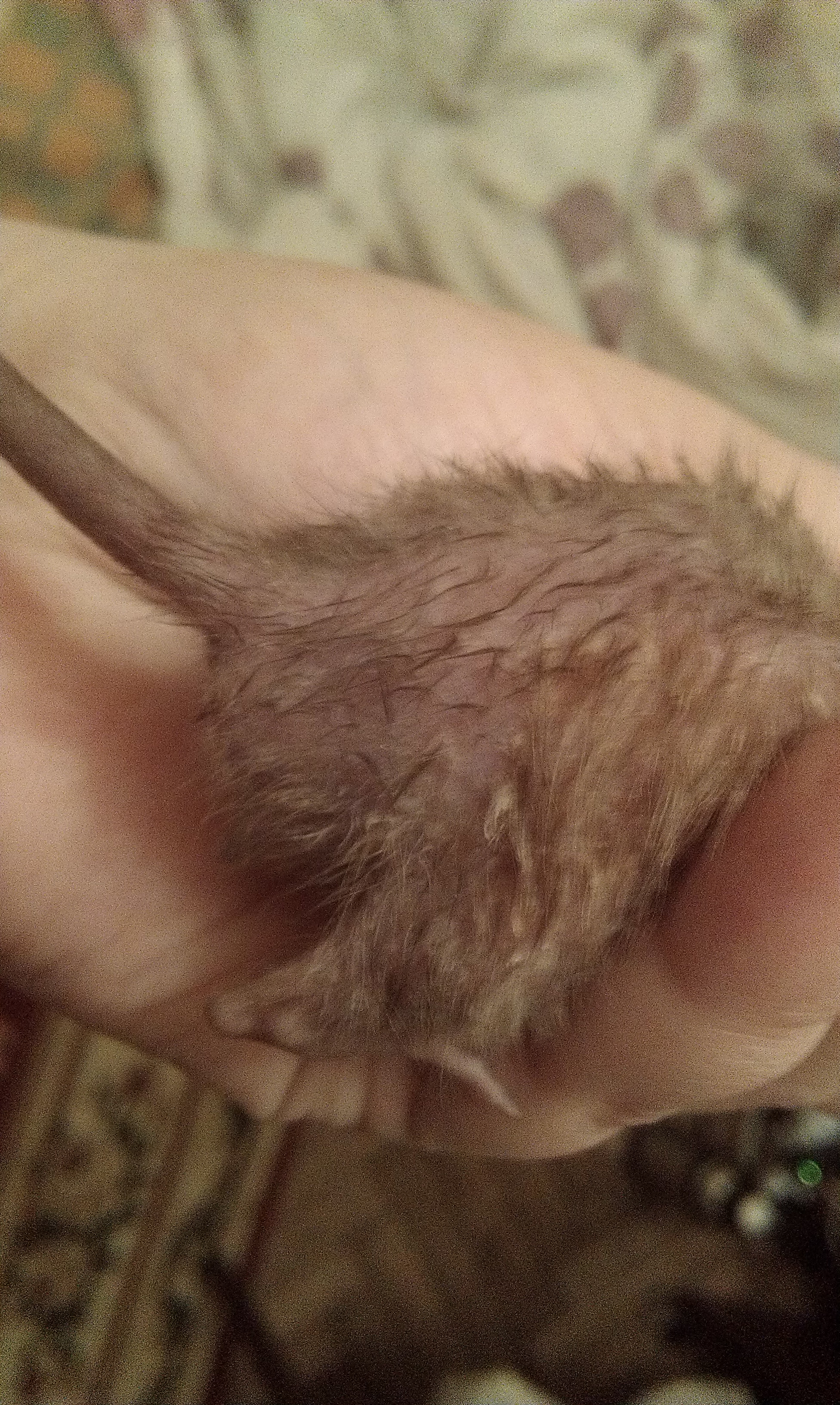 nali, крысенок совершенно нормальный. Линька у него - детская шерсть вылезает, будет расти взрослая. Шерстка такая редкая от того, что его плохо кормили.