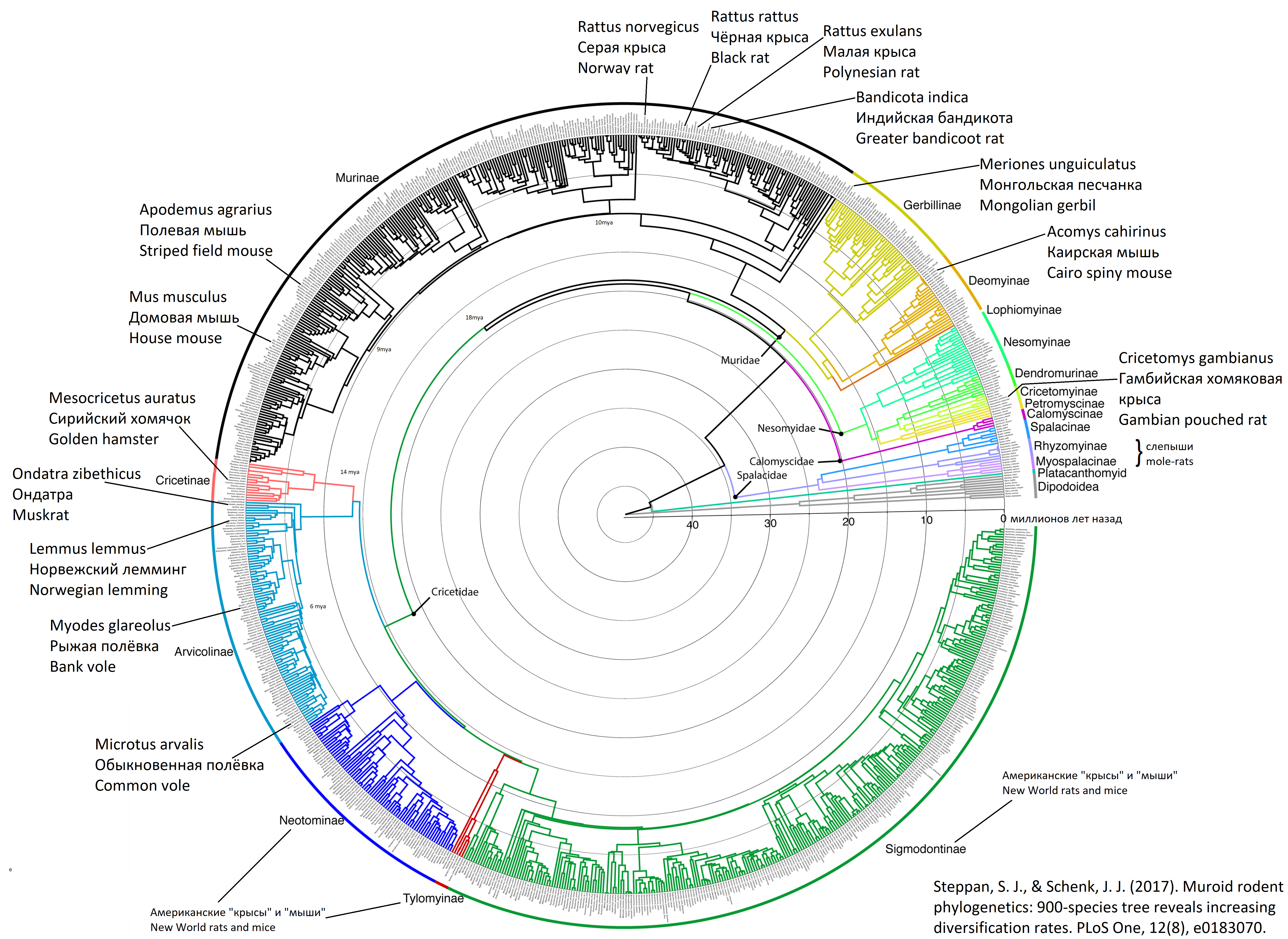 Это филогенетическое древо показывает родственные отношения между грызунами из надсемейства Muroidea. Надсемейство состоит из 1620 видов (30% всех видов млекопитающих), включая мышей, крыс, песчанок, хомяков, полевок и леммингов. Внутри круга приведены названия семейств, а снаружи - подсемейств, которые, кроме этого, еще обозначены разным цветом. Еще дальше от круга, крупным шрифтом я обозначил примеры известных видов грызунов.