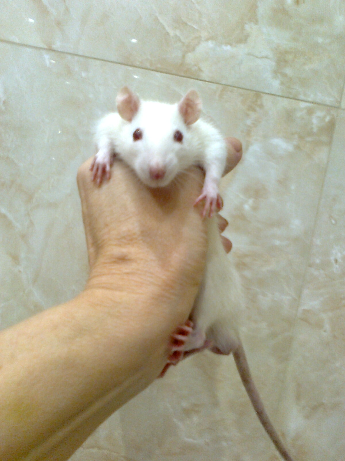 Воду беленький мальчик так и не пьет, только молоко. Очень расположен к человеку, ест с рук, ласковый и любознательный. С рук не слазит, как маленький ребенок. Других крыс боится. Сселить с Мышей не получается. Ребенок был простужен, поэтому знакомство отложили. Сейчас встал вопрос о подселении. Пытались познакомить их на нейтральной территории (на диване), чтобы они вместе играли и подружились. В результате оба дрожат, сердечки буквально выскакивают от страха. Подносила друг к другу - на нейтральной территории Мыша проявляет интерес, возле своей клетки встает в позу борца. Беленький пищит и скалит зубы на нейтральной территории, возле Мышиной клетки пытается убежать. Он, когда испугается, становится таким же шустрым и прыгучим, как пасюк. Ставила их клетки рядом, малыш зашивался под тряпочку и не выходил оттуда, Мыша наблюдал, пока не надоест, потом шел заниматься своими делами. Явной агрессии от Мыши я не заметила, хотя последнее время у него стал портиться характер. Не скажу, что он сильно ручной, но уже лучше, чем был поначалу. С рук по-прежнему не ест, но йогурт слизывает с удовольствием. Мои руки воспринимает спокойно, к другим людям не идет. Ровно относится к тем, кого видит постоянно, но на руках не сидит, даю его мужу подержать, он тут же перепрыгивает обратно ко мне, при малейшем шорохе прячется у меня под халатом. Чужих же не воспринимает вообще. Увидит незнакомца, и тут же зашивается под тряпку, на руки не идет, может и цапнуть, если я засунула руку в клетку, а рядом посторонний. Последнее время стал очень кусачий, кусает меня, причем старается куснуть посильнее, до крови, хожу с забинтованными пальцами, предугадать, когда укусит трудно. Может слизать йогурт у меня с руки, потом напасть на эту же руку. Один раз гулял по дивану, рядом лежала моя рука, ни с того ни с сего распушился, как ежик, зашипел и прыгнул мне на руку, впился зубами, а передними лапками принялся буквально раздирать мою ладонь. Если он хотел куда-то бежать, а я не пустила, нападает и кусается. Не любит, когда переворачиваю пузом вверх. После этого он обязательно взъерошивается и с угрожающими криками нападает на мою руку, я уже не лезу чесать ему пузико, но периодически он все равно кусает меня для профилактики. Возможно, он злится, что не пускаю к девочкам. Поэтому хорошо бы сселить его с другом, но как лучше это сделать, когда они не хотят общаться? Беленький шипит и скалит зубы, Мыша, вроде бы, спокоен, хотя сердечко колотится. Выпускать их в ванне боюсь, Мыша хоть и мелковат, но очень сильный и крепкий, если вдруг проявит агрессию, могу и не успеть. Если беленький проявит агрессию, а Мыша ответит, тоже могу не успеть. Оставить, как есть, пусть каждый живет в своей клетке?