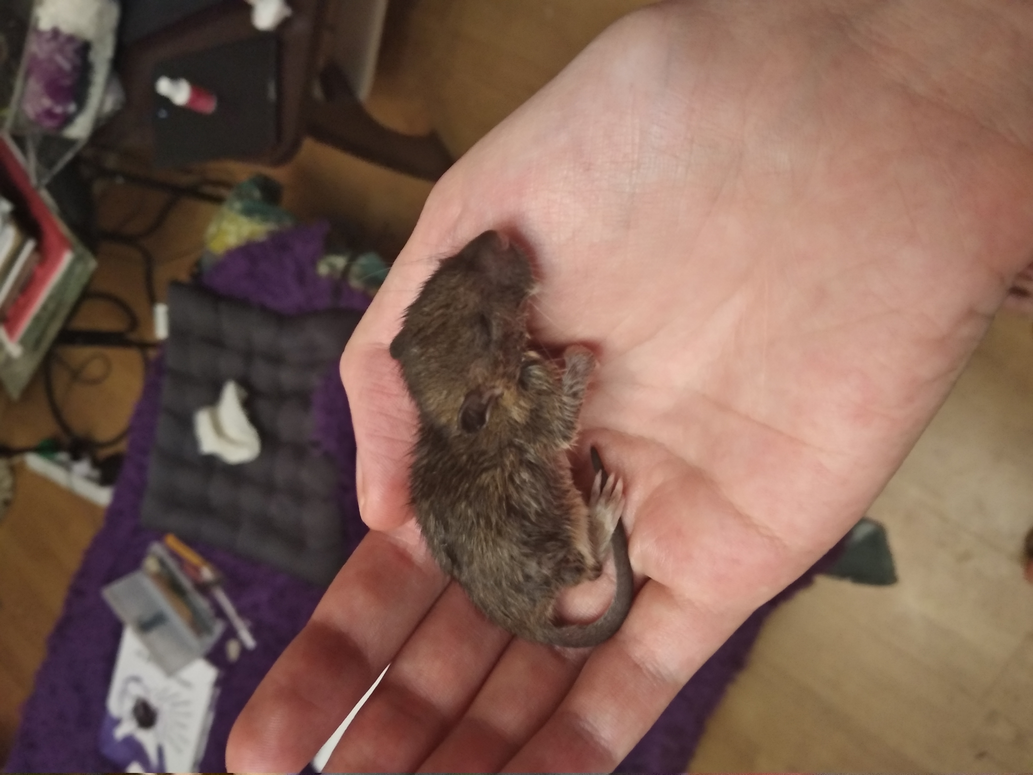 Крысенок был слепой еще совсем. Щас начал глаза открывать, в клетке совсем сидеть отказывается, просится постоянно на ручки, коммуникабельный крыс такой выходит у нас.