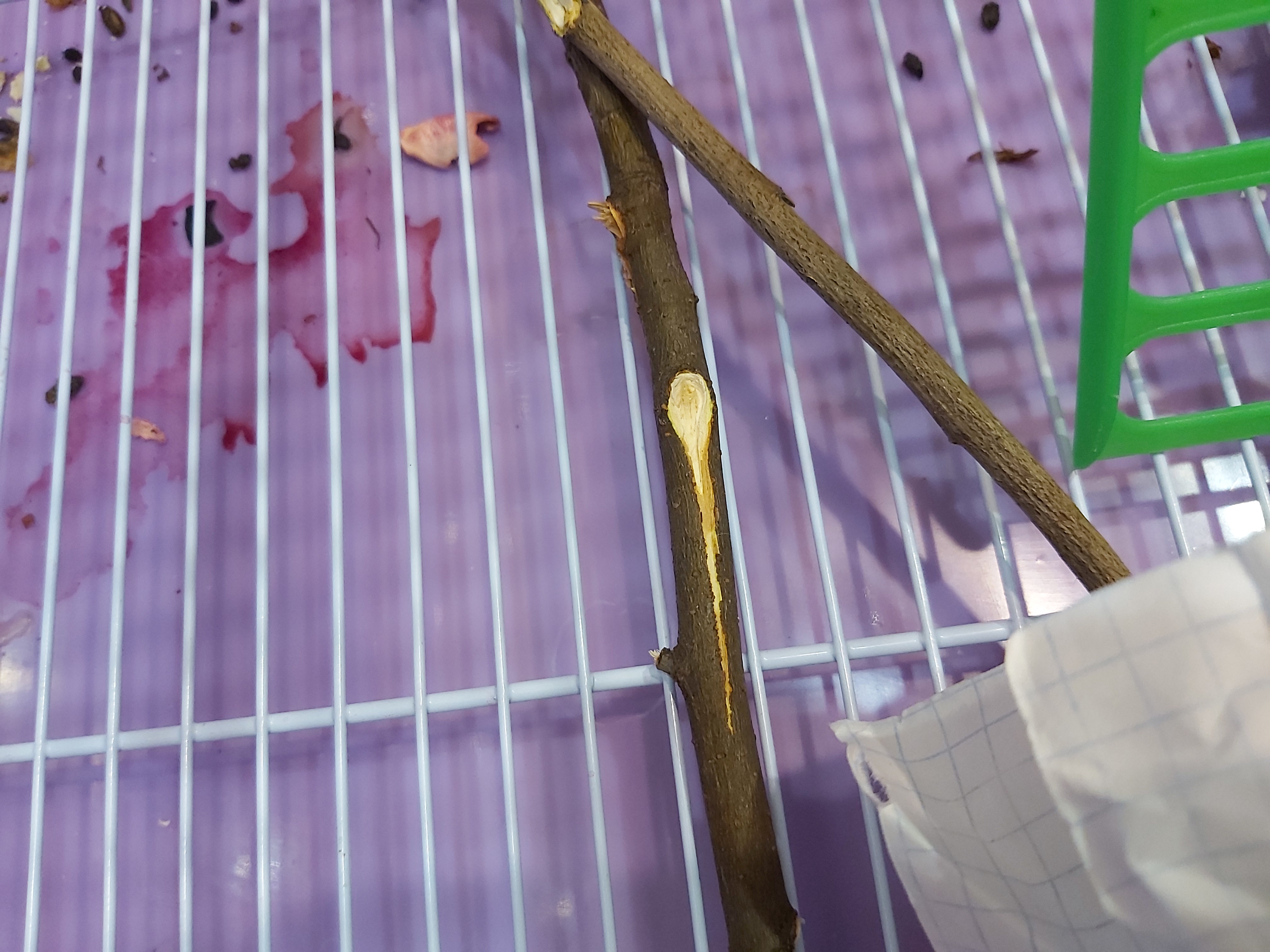 Тот небольшой кусочек чего-то, что было намочено, это случаем не свекла или какая-то ягода, может кусочек каркаде? Пятно очень похоже на растительный краситель. На кровь не похоже. Обычно так бывает, если налить воды или мочи на кусочек сушеной свеклы. Проверьте состав корма и того мусора, что на дне клетки валяется.