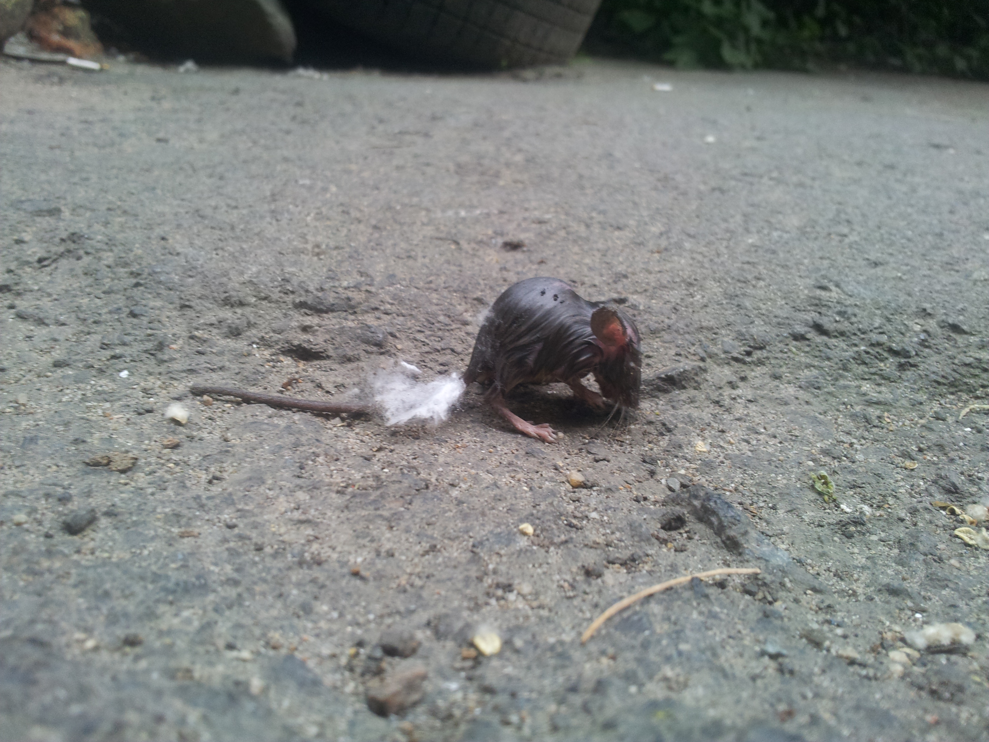 Кстати, я думаю, это мышка, а не крыса. Не бойтесь ее трогать, просто мойте руки после этого с мылом. Сейчас главное смыть что бы то ни было у нее на шерсти. И поставьте грелку или бутылку с теплой водой радом с ней, чтобы не мерзла.