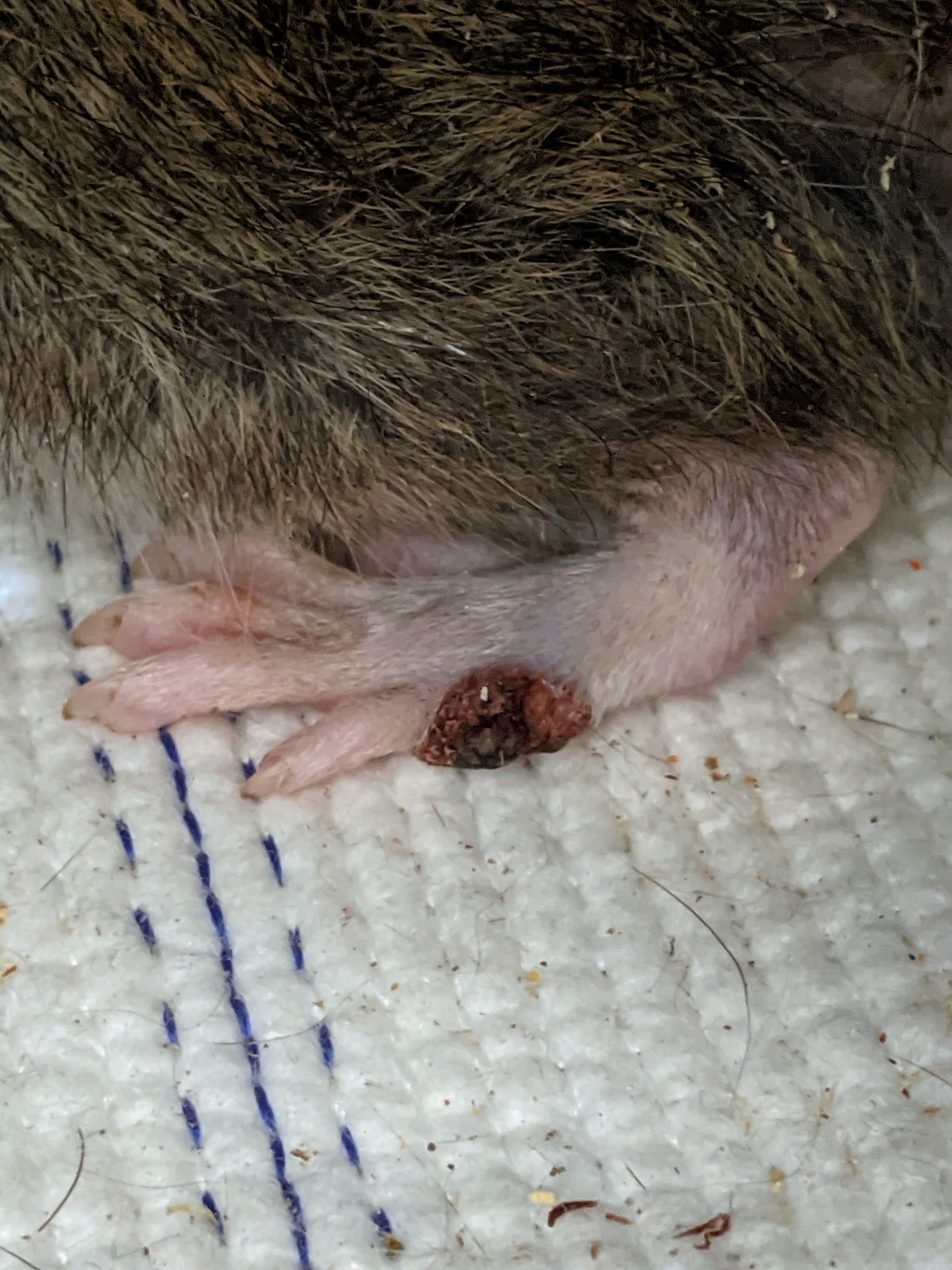 на вид крысюк стал хуже, худой совсем, писюн какой-то красный и опухший, а помыть я ему не могу. и на лапе обнаружилась странная то ли рана, то ли прыщ.