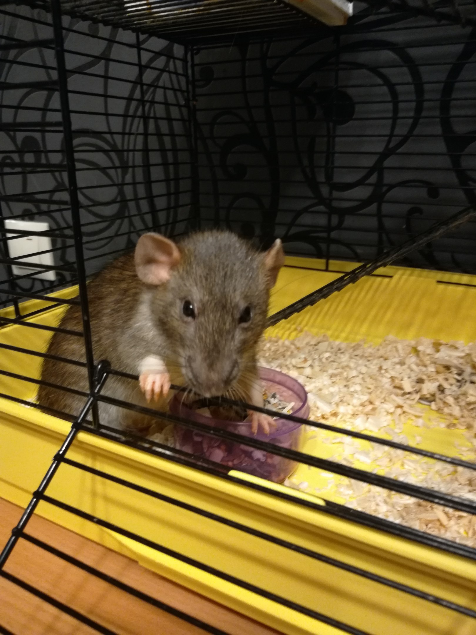 ). Я стала пытаться ее социализировать, сейчас, спустя больше чем пол года, Плотва не прячется, когда я подхожу к клетке, может взять лакомство из руки, поставить на меня лапу,дает залезть в клетку, чтобы досыпать ей еды, проявляет любопытство к людям, но, самая большая проблема так никуда не ушла-покусы. У меня постоянно покусы на руках, хоть в клетку я лезу только в перчатках, да и она, в принципе, остервенело хватает зубами все, что оказывается возле клетки. Всё осложняется тем, что кроме меня, невольными заложниками ситуации являются муж, собака и кот, и если муж с собакой получили пару укусов и больше не хотят вступать в контакт с Плотвой, то кот-то-ли мазохист, то-ли пацифист, но он постоянно тусуется возле ее клетки, спит на клетке, трется об нее, а маленькое исчадие ада не упускает возможности вырвать коту пару клоков шерсти или покусать за лапы, а изолировать их друг от друга в моей однушке-студии не представляется возможным. В силу вышеописанного, Плотву невозможно выпустить погулять, помыть или обработать. Она просто существует в клетке перебираясь из гамака в домик, поесть, и обратно. Я понимаю, что если она заболеет, то я элементарно не смогу, оказать ей помощь и дополнительный уход. Я уверена, что она не безнадежна, и при должных усилиях ее можно социализировать, просто я не крысовод и в мои планы вообще не входило содержать крысу, а тем более, такую своеобразную. Я честно пыталась на протяжении 8 месяцев, но, очевидно,что у меня недостаточно времени/желания/сил/опыта, чтобы содержать не ручную крысу. По этому я очень рассчитываю найти для Плотвы опытного крысовода, который согласится ей помочь и сможет обеспечить нормальную жизнь в компании с другими крысами. Очень надеюсь, что такой человек здесь найдется, Плотве очень тяжело живется в ее одиночной камере.