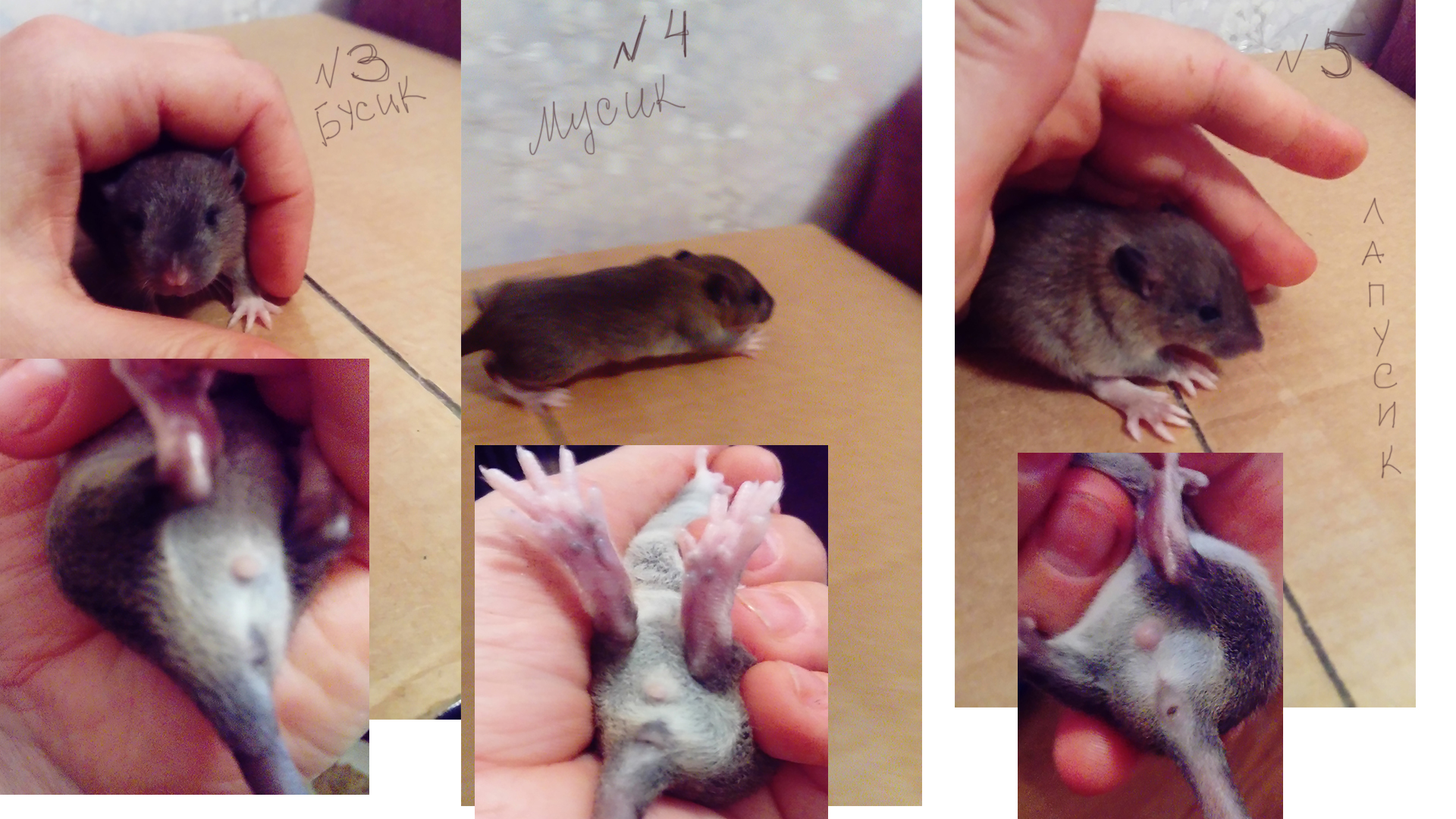 А у остальных на самом деле не видно. Она единственная от остальных отличается и мельче размерами сейчас. Странно. конечно. но. может быть. действительно 9 мальчишек и всего одна девочка. Тем более что зачатие и большая часть беременности прошла в условиях природы. стресс. опасность для декоративной крысы - природа в "условиях войны" обычно больше самцов старается произвести. крысы. наверное. не исключение.