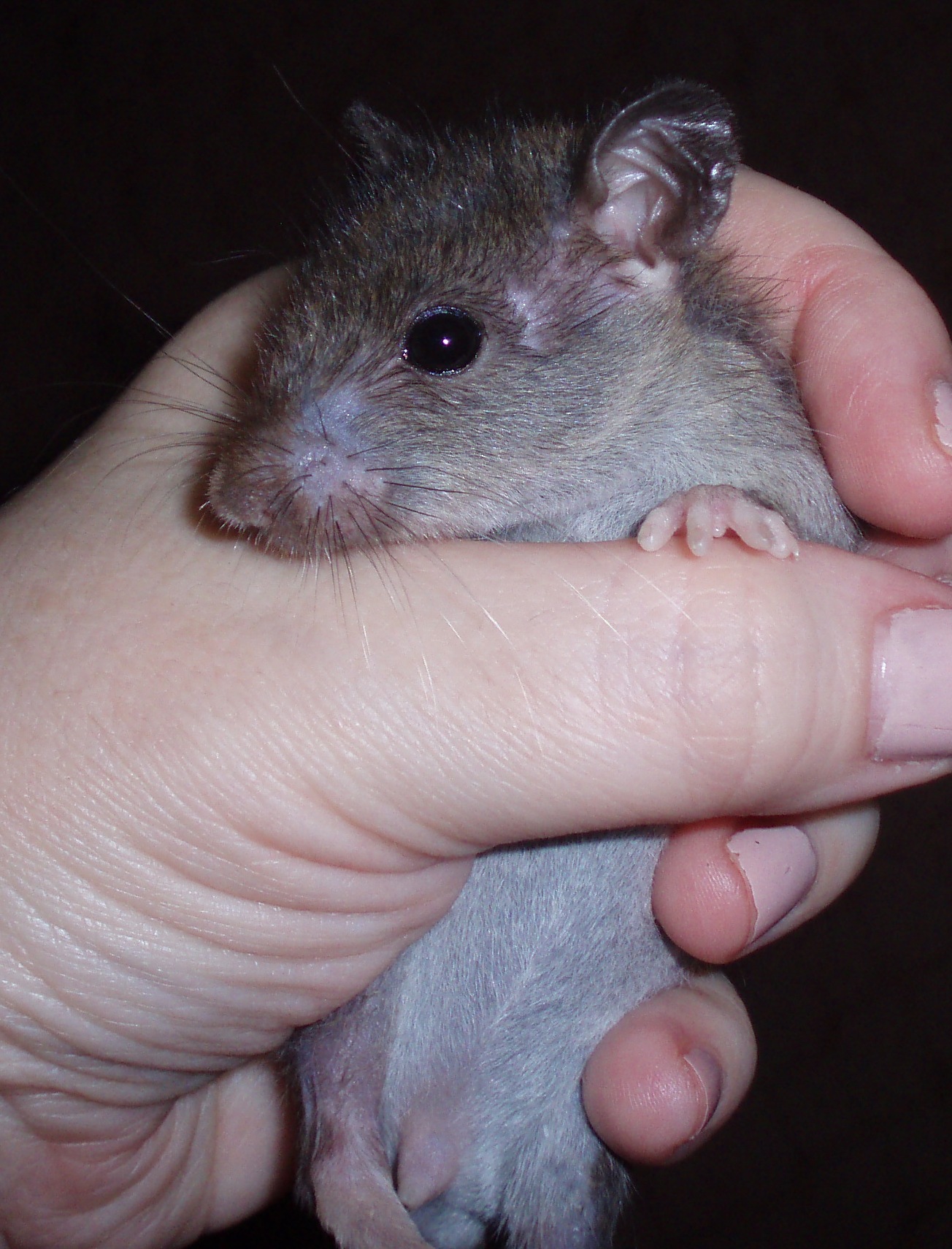 Неделю назад Степашка приехал ко мне, вес был 32гр, фото не очень, но какое есть - видно что еще мелкий совсем, шерсти на животе и щечках нет:
