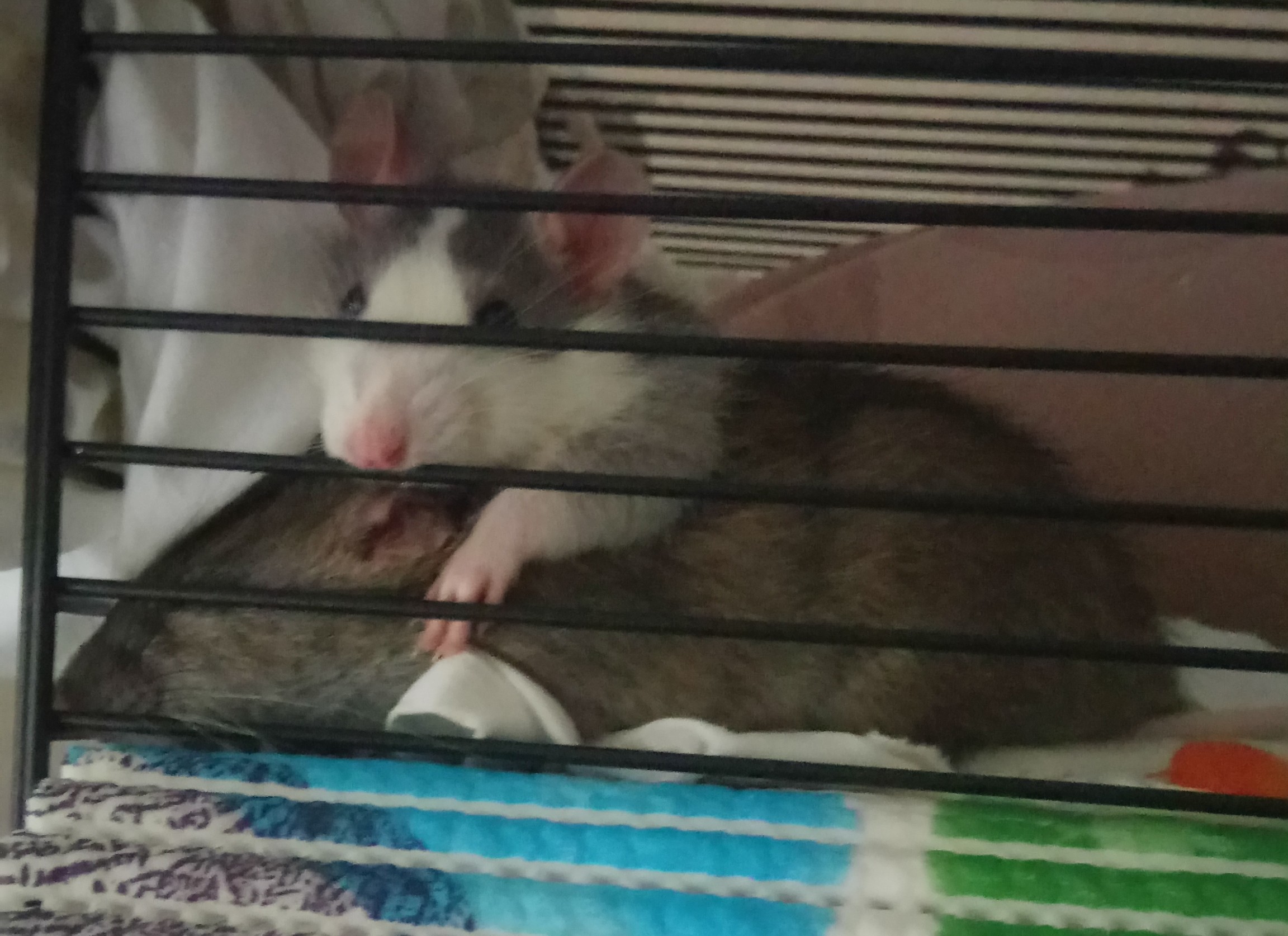Так мы спим - то хася на пасе, то пася на хасе. Наблюдала интересную картину...одна декорашка стояла прогнувшись, пася у неё на спине, а третья вроде вылизывала под хвостом...я читала, что они помогают друг дружке при течке - это вот так происходит? А ещё мне интересно узнать по поводу размеров. Как нам сказали, декорашки родились 1 ноября, но они сейчас почти как пася, которой уже 4,5 месяца, пасюки вырастают мельче или просто хозяйка перепутала возраст подружек? У неё много разновозрастной детворы...