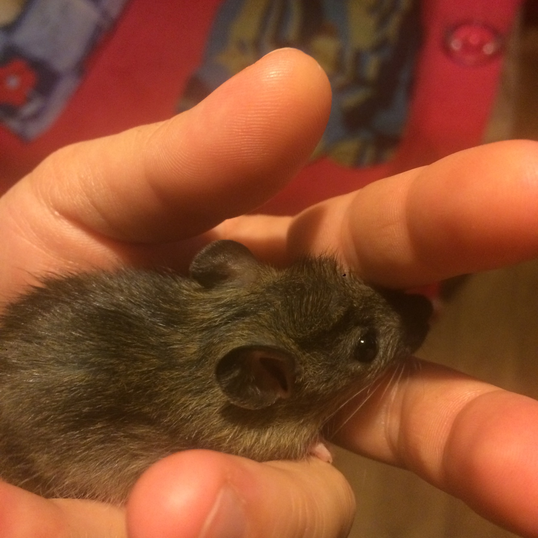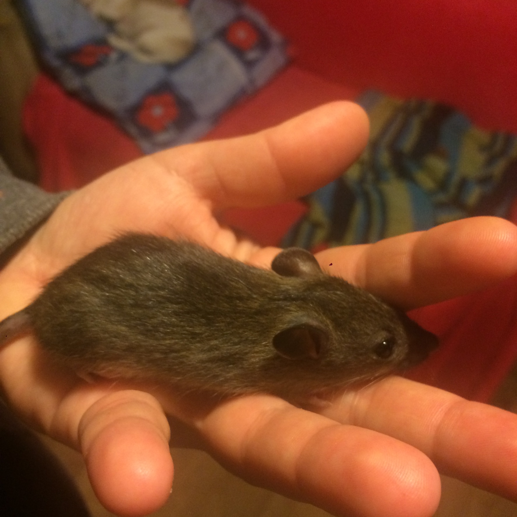 Осталась только малышка девочка .. ношу ее за пазухой тк она совсем загрустила и стала совсем трусишкой оставшись без братишек :( правда с руки корм принципиально отказывается и брать и даже пробовать! ](*,) в руках то есть в ладошке сидит неохотно , когда берёшь постоянно куда то бежит ,торопится удрать,вывернуться ,насильно приходится Ее удерживать! Сую Ее сразу за пазуху так она и там как шило в попе крутится бегает потом правда успокаивается и затихает на боку или на пояснице почему то :-k не могу обьяснить Ее поведения только как возможно она мне попадалась реже всех и получается нянькала я в основном мальчишек ТК они все в глазах перепутались и я уже не понимала кто в руках был кто ещё не успел #-o хех или это все девчонки такие нервные и пугливые впринципе? Надеюсь она не переймёт характер своей мамки 8-[