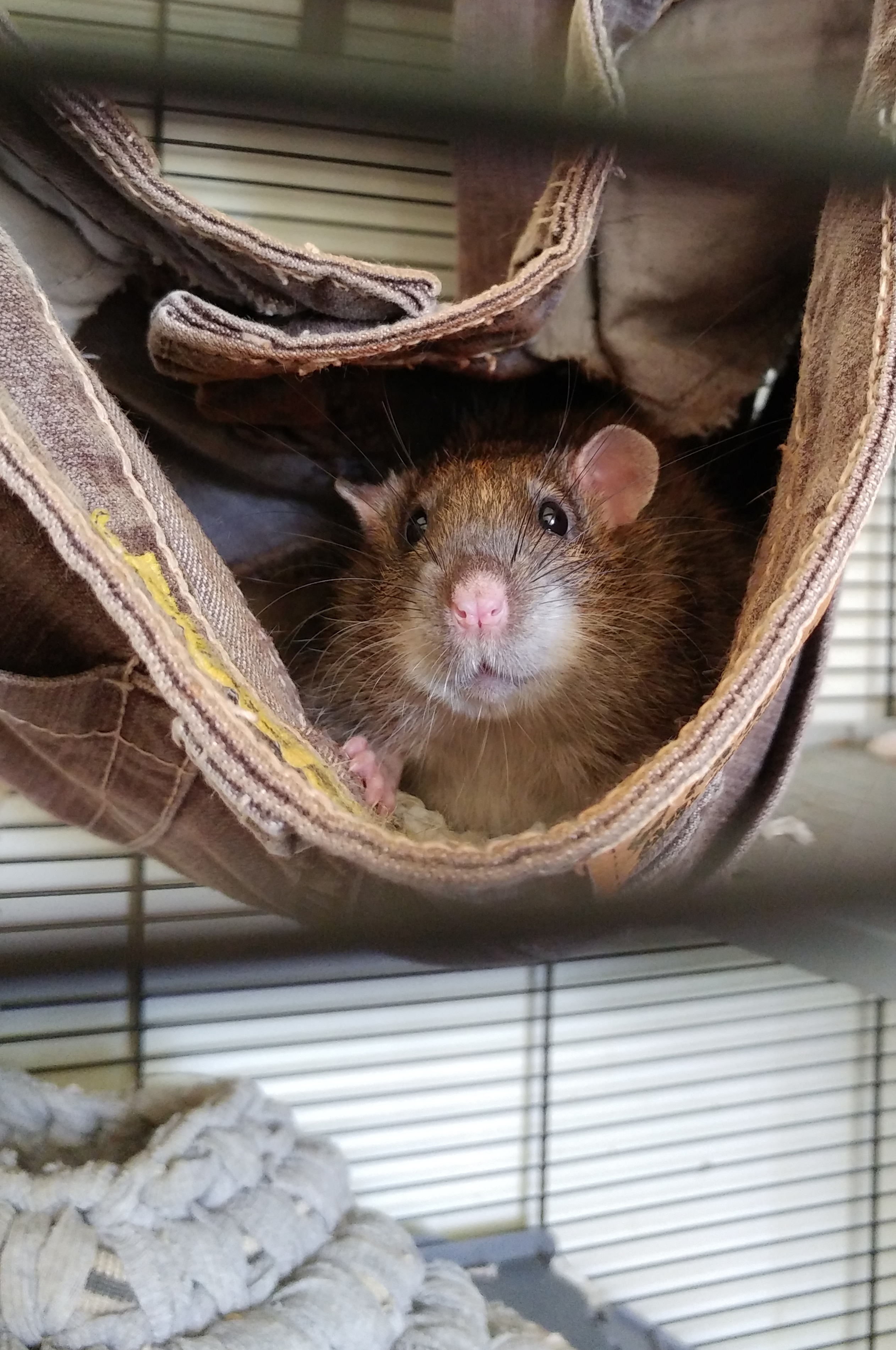 когда вернулась поняла, что в спешке заперла Пасюка снаружи клетки. за эти пару часов он одичал достаточно, чтобы забиться между рамами окон и жалюзи и решить там жить. на зов приходил, но в руки не давался, ещё и палец мне зачем-то прокусил.