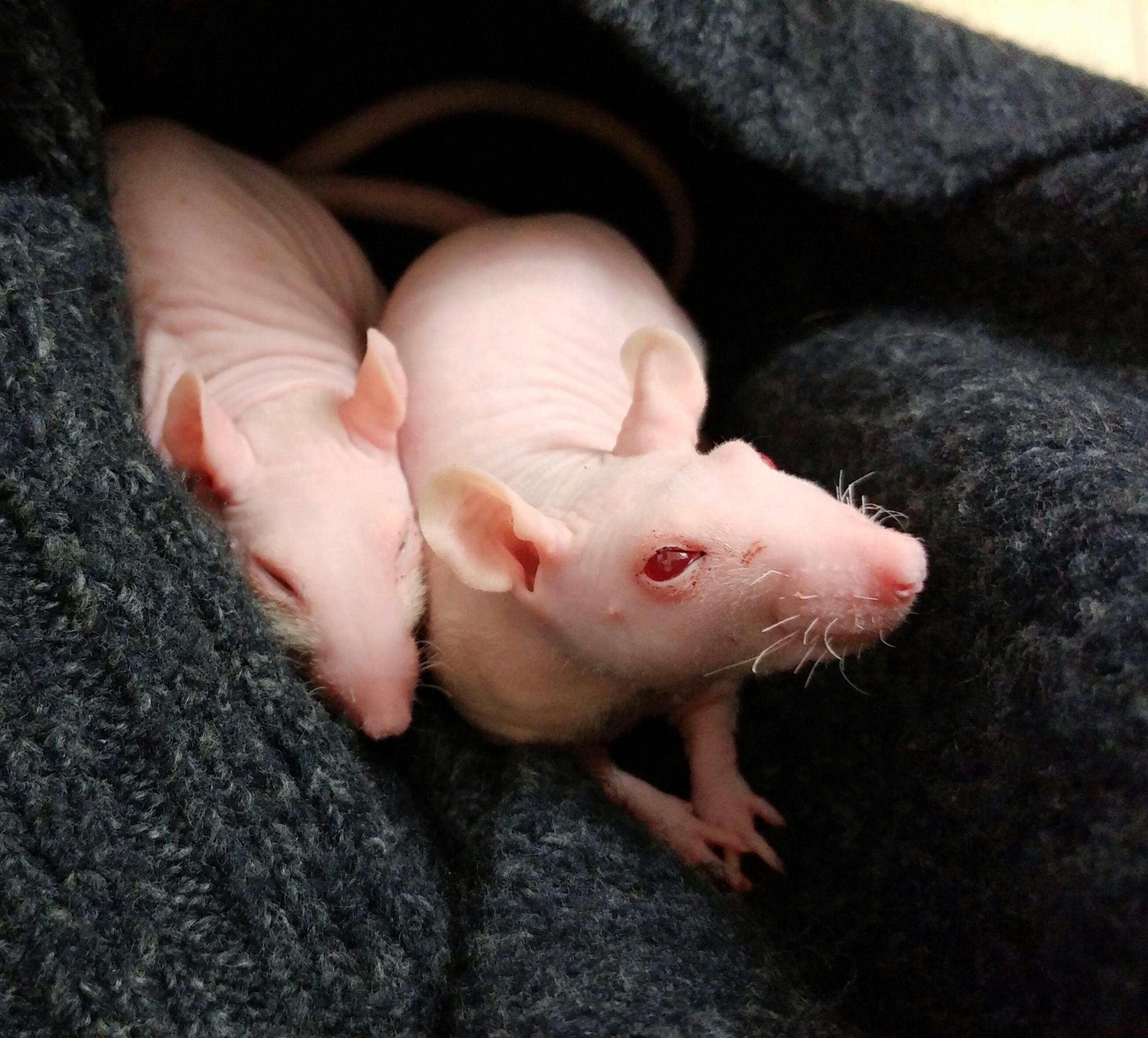 подселение кое как продвигается. на нейтральной территории лысята пасюка не интересуют, на входе в клетку нюхает и скалится, цапает легонько за носы, внутри клетки выслеживает, выкапывает из тряпочек и кусает за спину. девочку легонько, она верещит, но вся целая, а мальчик весь поцарапаный уже, причем половина всех покусов у него от сестрички, она его время от времени из своих гамаков гоняет (они всё ещё живут вместе в маленькой клетке, боюсь их на ночь пасюку оставлять)