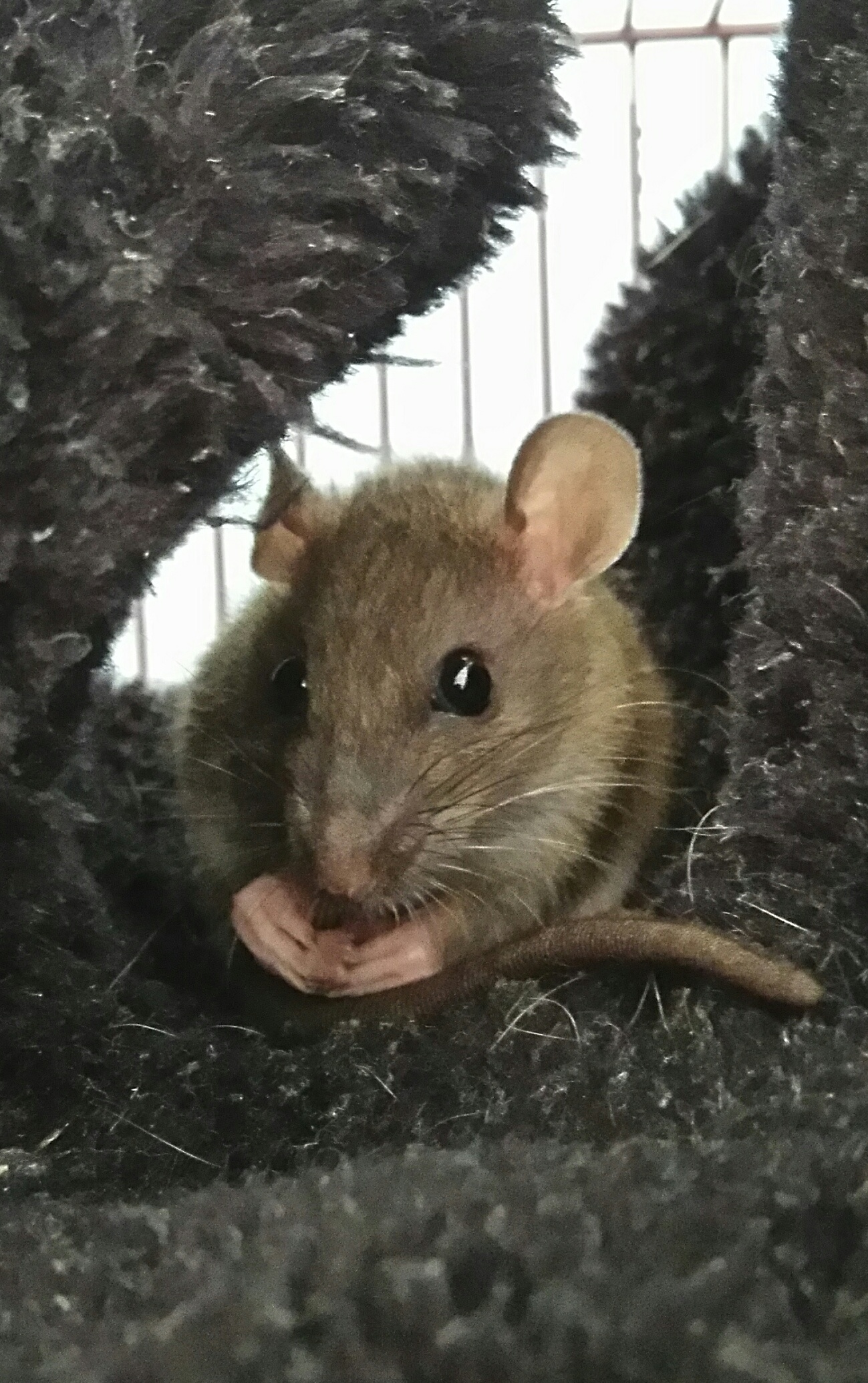 По сей день любит жевать мои пальцы, хотя ни разу не прокусила, просто схватит и смотрит изучающе прямо в глаза, комнатный террорист просто, наши декоративные смущённо отворачиваются от неё, если поднести. Зато быстро распробовала всяческие крысиные деликатесы и привыкла к мягким постелькам