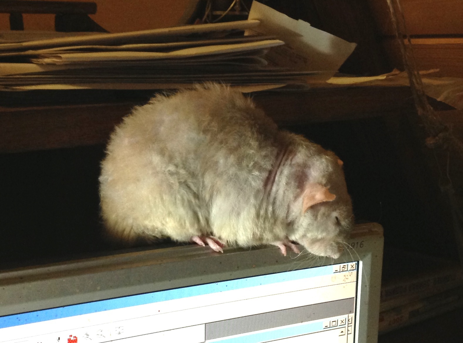 Крыса очень худая (была худой и маленькой всегда), почти все время спит в домике или у меня на плече. В последнее время предпочитает сидеть и дремать на плече. Когда пытаюсь её снять, начинает хныкать и проситься " на ручки". Несмотря на свой возраст, достаточно активна - "вбегает" на руку, залезает на монитор или полку. Каждый раз скандалит, когда приходится сажать её в клетку на ночь (днем она на моем рабочем столе. На столе есть её второй домик, кружка с водой и кормушка. Куча ухоронок и заначек, гамачок и еще много очень ценных крысиных вещей).