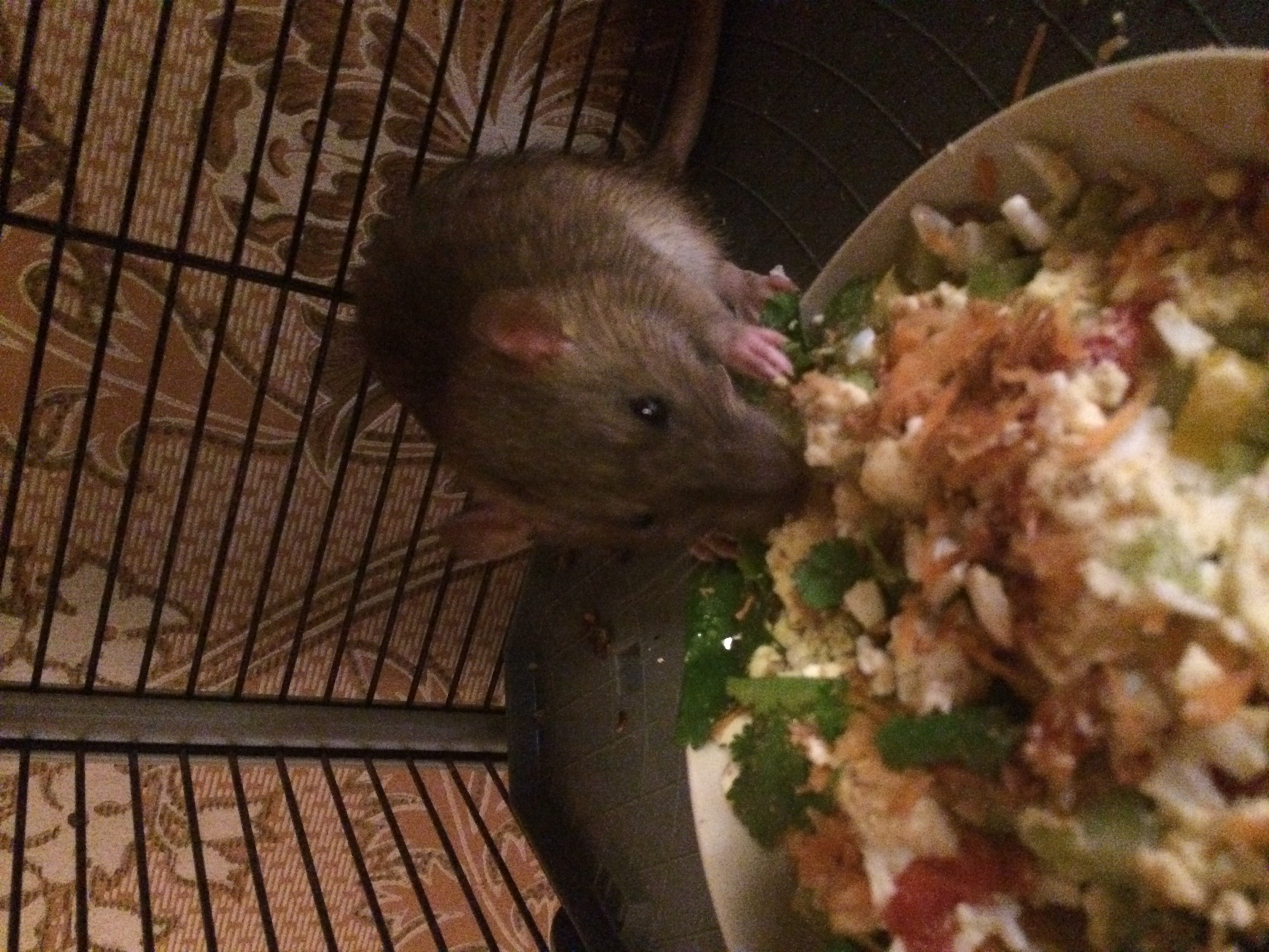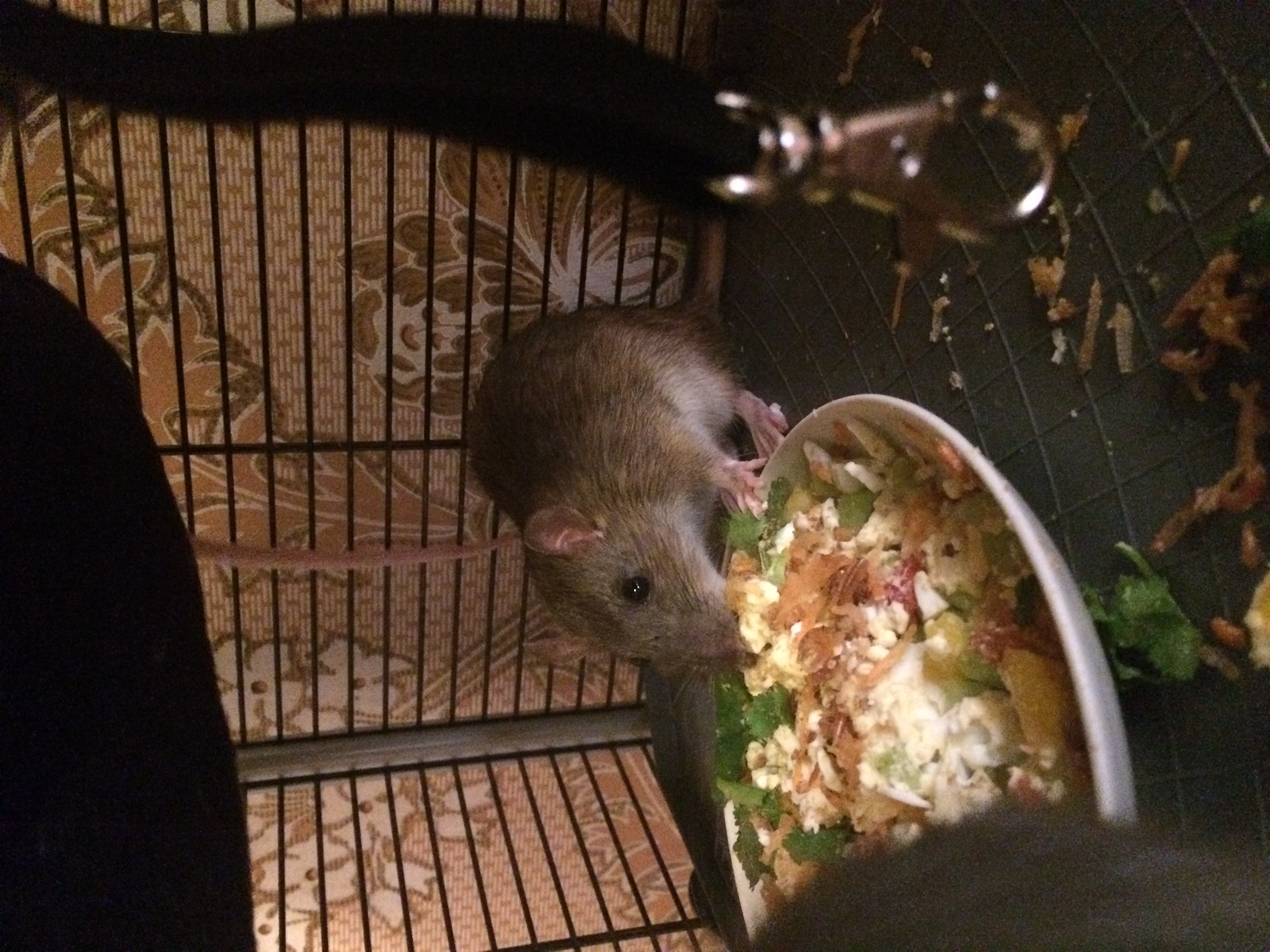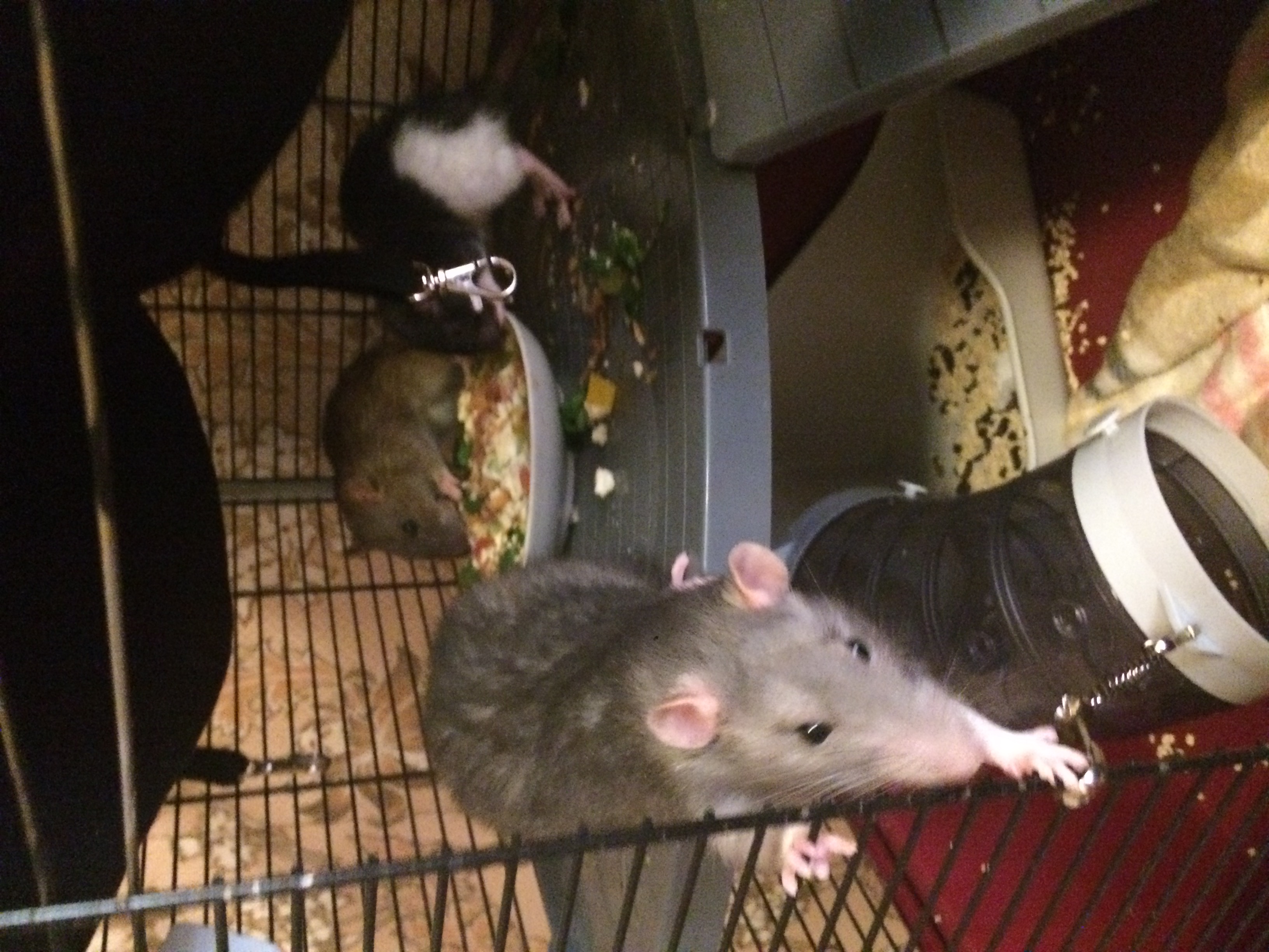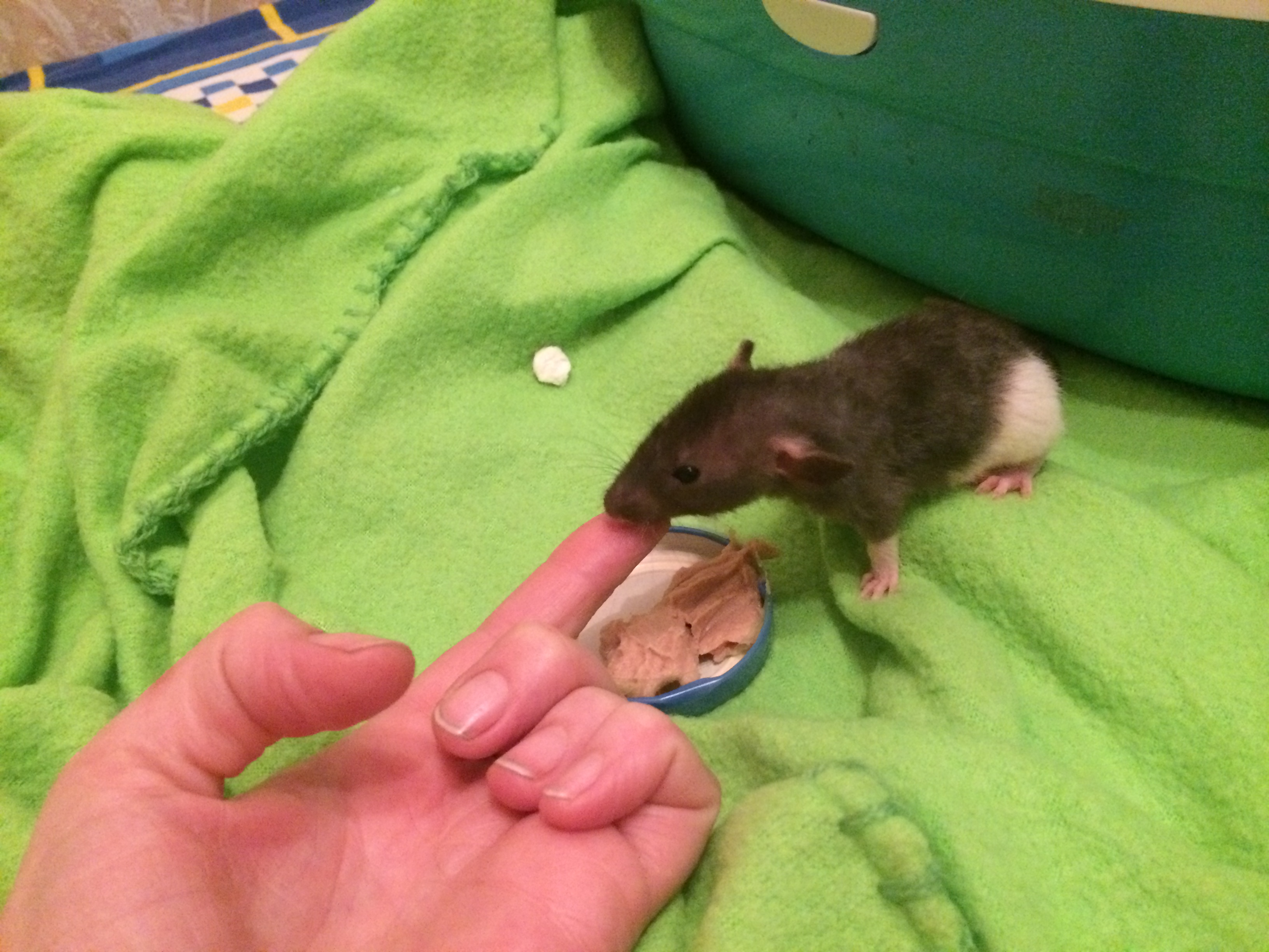 Итак история Кукуси. Первого сентября в одной из групп в ВК я наткнулась на пост девушки, которая писала, что видела как в Москве, на ст. метро Перово две соплячки раздавали крошечных крысят, и она, эта девушка не смогла их забрать, потому что сама в Москве в гостях и потому что средств на крысят нет. От слова совсем. Что меня дернуло ей написать и предложить помощь? Не знаю. Почему я сразу ей написала, что если там будет девочка, то я её возьму себе? Тоже не знаю. Знаю лишь то, что не представляя даже как может выглядеть крысёнок я решила, что это - моя крыса. На следующий день девушка забрала трёх крысят, им было меньше месяца и весили они в среднем по 24 грамма. Тогда я и увидела их на фото, но пол крысят ещё был не определён. Два крысенка -черные капюшоны, шерсть и ухи- стандарт. А третий тоже капюшон, недорекс, но очень красивый и дамбоухий. Как же мне хотелось чтобы именно дамбоухая прелесть оказалась девочкой...