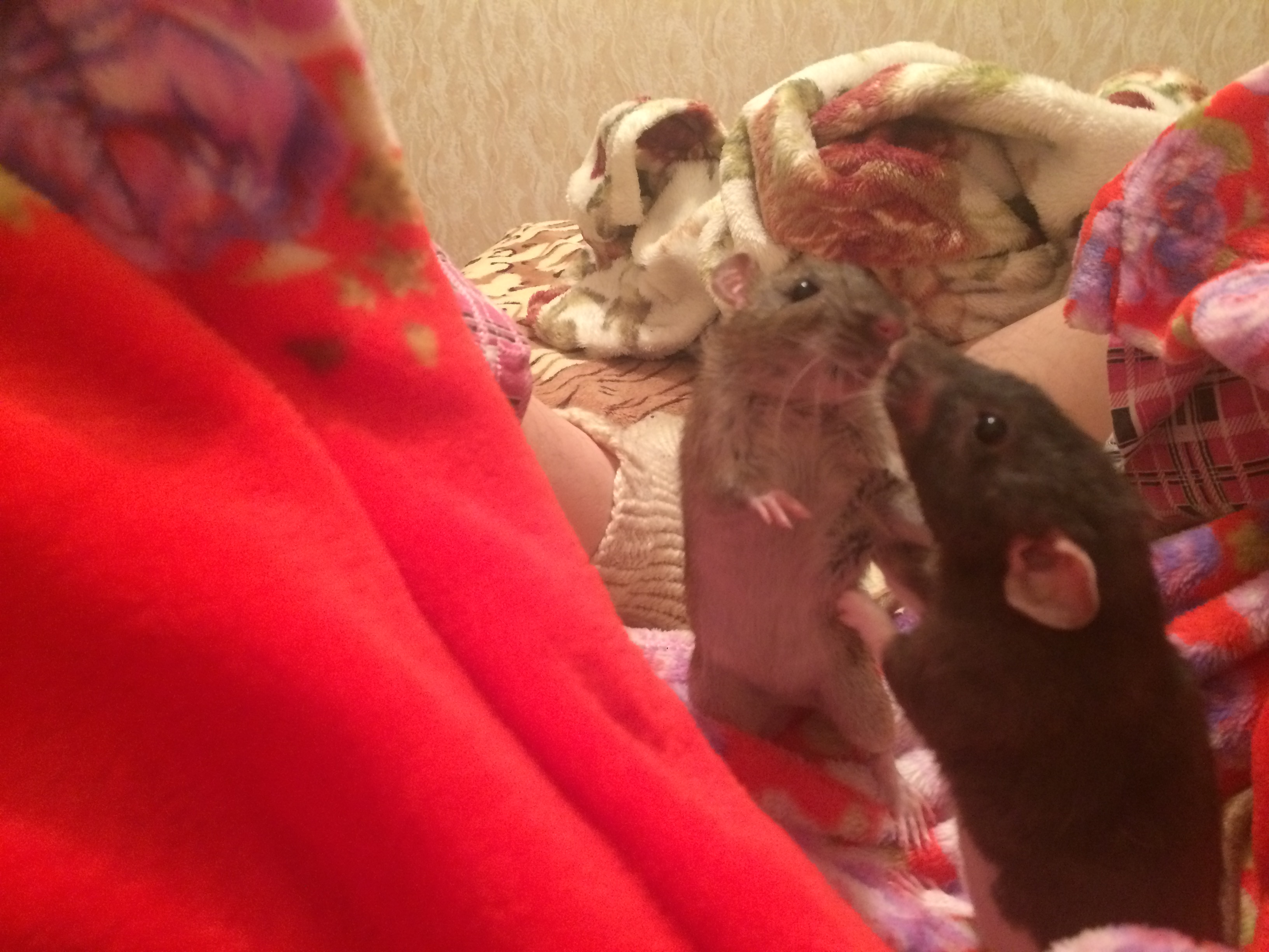 Выросла моя пасюха ~{}3>* Сегодня с утра чуть инфаркт не получила: встала с кровати, а эта засранка возьми да и прыгни сзади на меня. Я её и не видела даже. А она промахнулась и вместо того, чтобы попасть на меня, оказалась на полу. И тут же нырнула под кровать. Ну, думаю, все, хана воскресному дню. Придётся до вечера моё пугливое Счастье оттуда выманивать. Позвала её, ни на что особо не надеясь. А эта невероятная крыса вдруг метнулась из под кровати к моим ногам и мгновенно вскарабкалась на меня. И как ни в чем не бывало начала мне щеку вылизывать! Я была в шоке и очень рада тому, что она наконец начала полностью мне доверять.