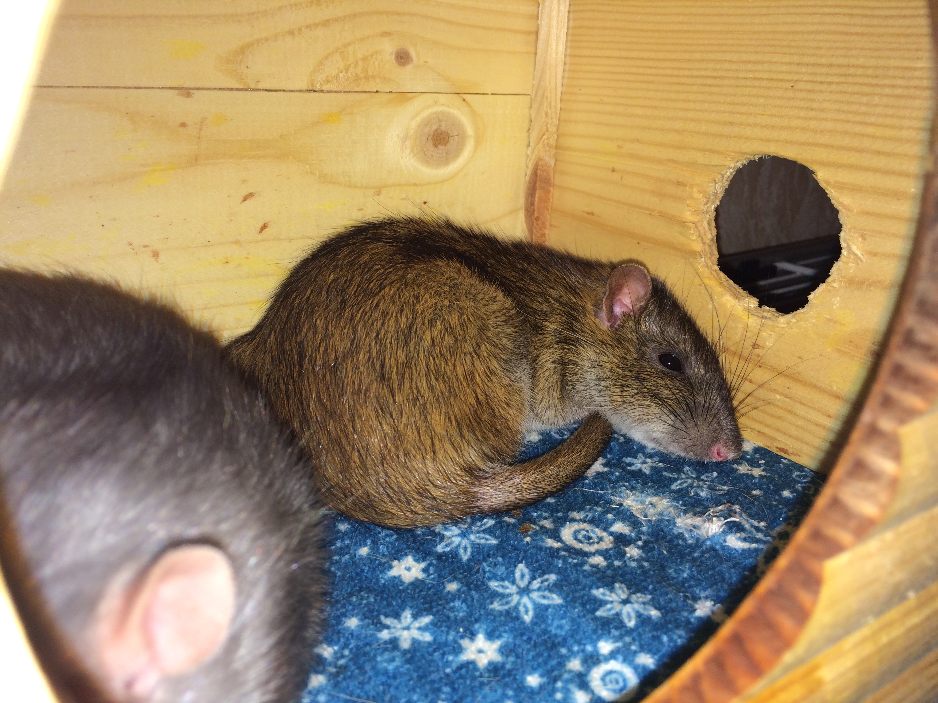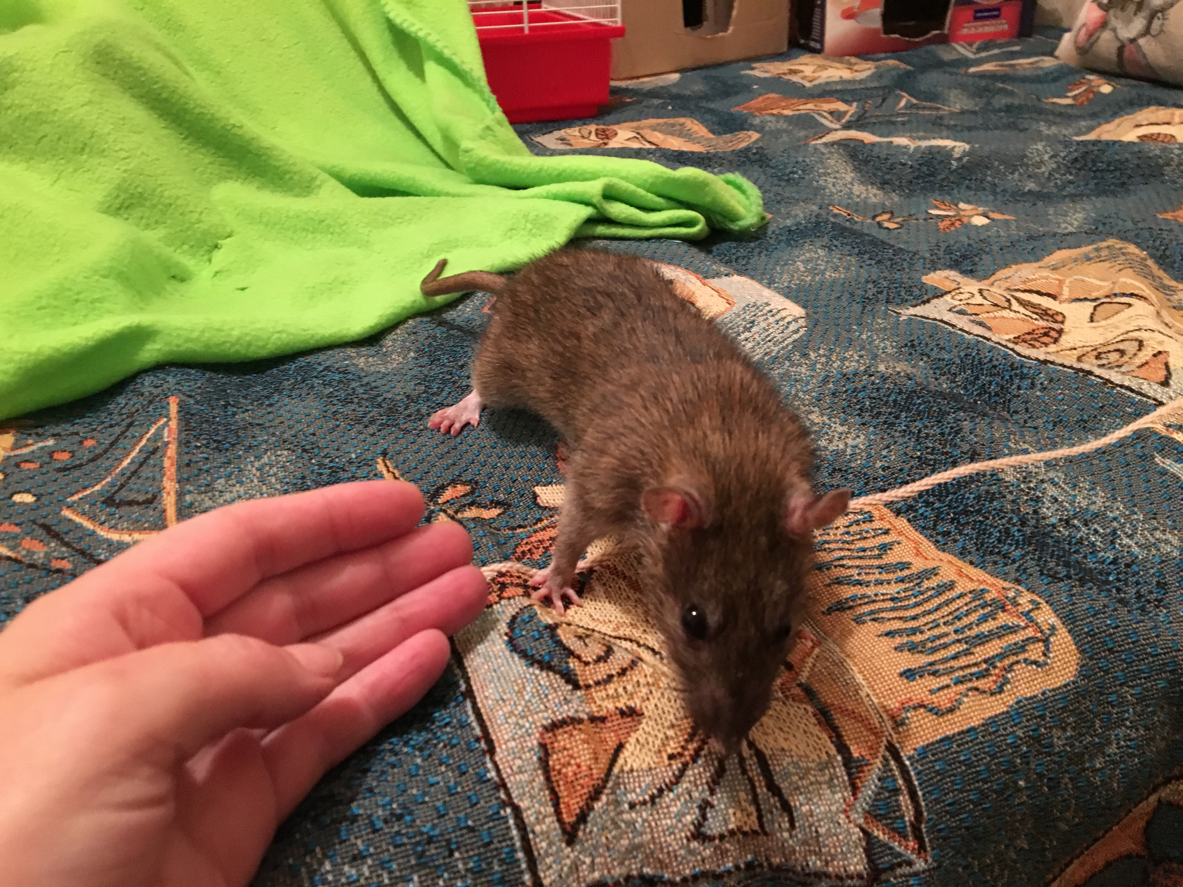 У нас все очень-очень хорошо и Пасенька стала очень понятливой, умной и условно ласковой крысой. В августе-сентябре я уезжала в Грузию, а крысодевочки были на передержке. Пася приняла Алену и брала у неё еду из рук, правда один раз все таки укусила.