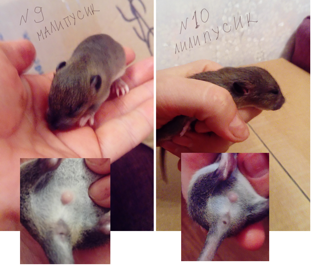 А у остальных на самом деле не видно. Она единственная от остальных отличается и мельче размерами сейчас. Странно. конечно. но. может быть. действительно 9 мальчишек и всего одна девочка. Тем более что зачатие и большая часть беременности прошла в условиях природы. стресс. опасность для декоративной крысы - природа в "условиях войны" обычно больше самцов старается произвести. крысы. наверное. не исключение.