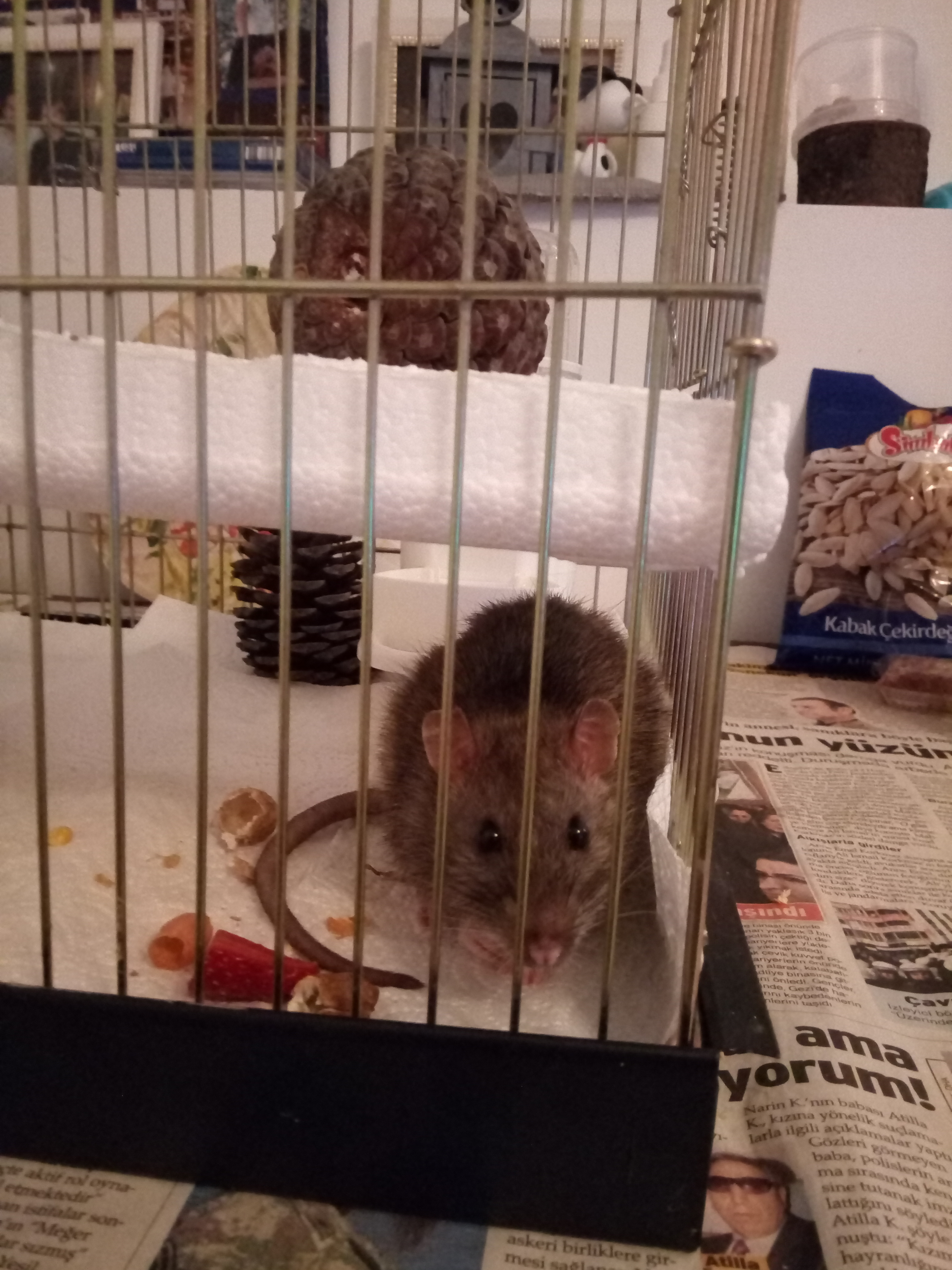 . Крыска выглядит уставшей и апатичной. Конечно под унитазом ведь не так комфортно, как в клетке, однако Джери не выбрал клетку. Значит доверие к нам ещё очень слабо, а страх силён