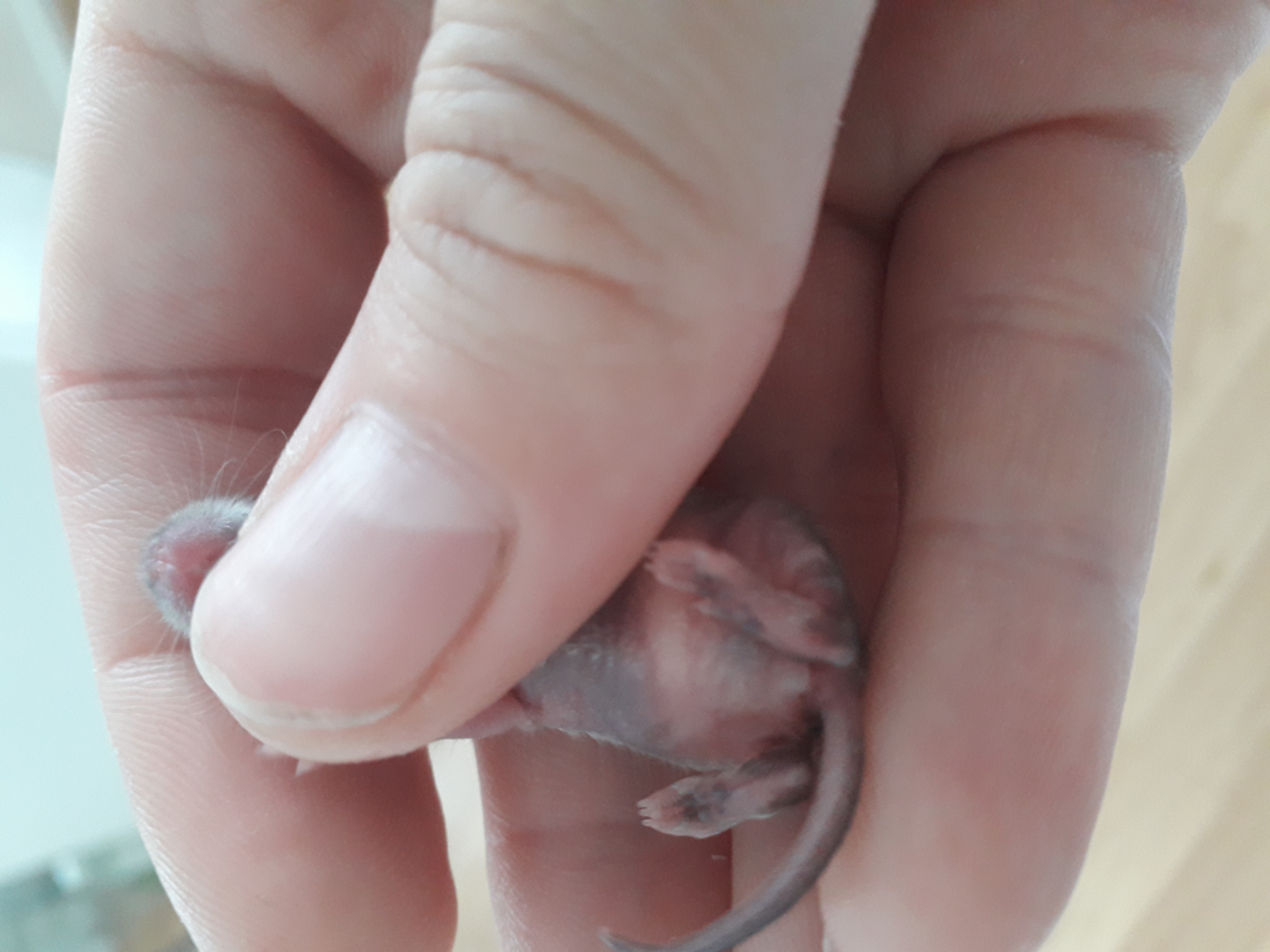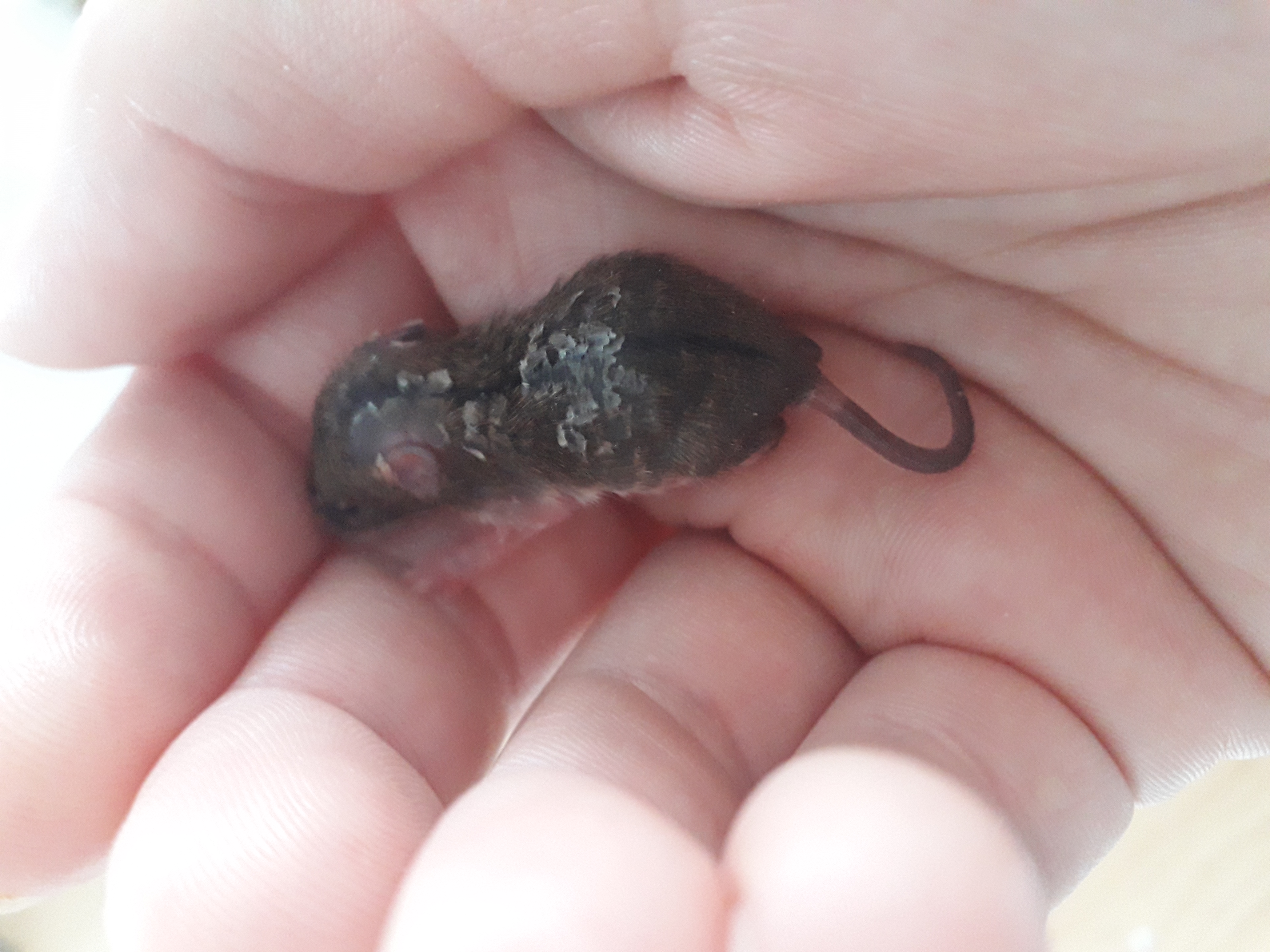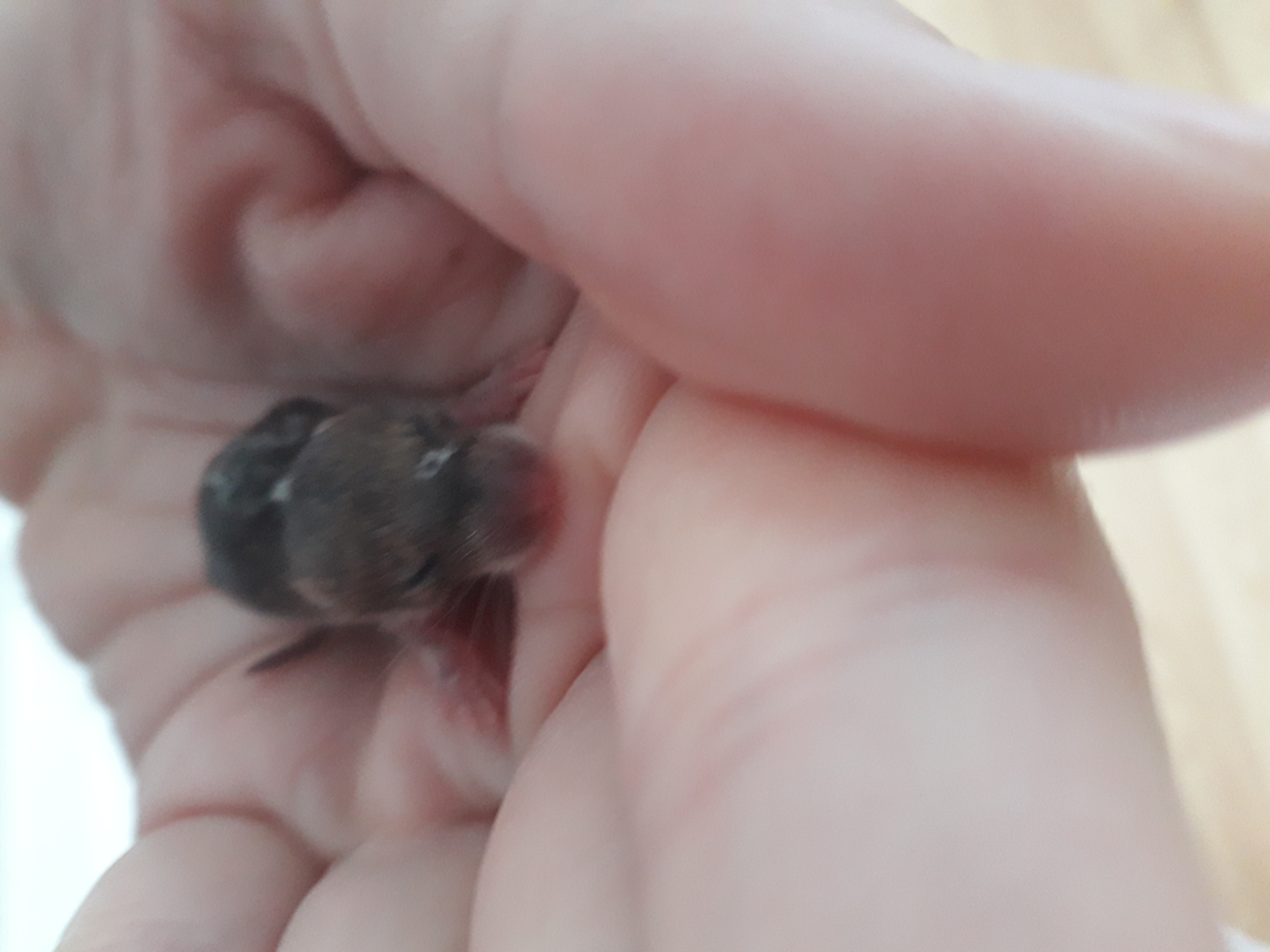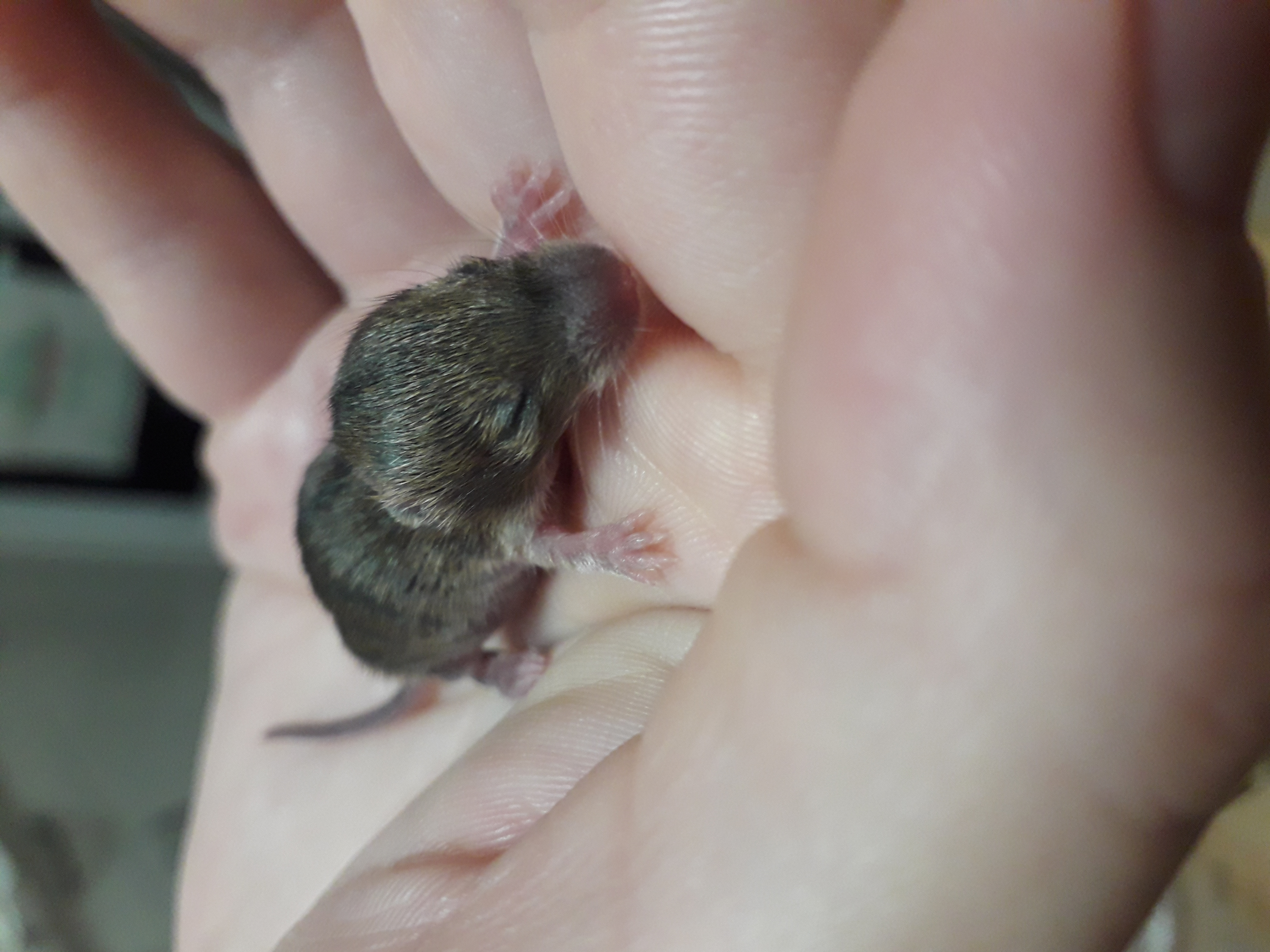 Здравствуйте! Только сегодня зарегестрировалась, если что-то неправильно пишу/спрашиваю, заранее извиняюсь... Сын во дворе случайно нашёл слепыша голенького крошечного на земле, был грязненький, холодный, открывал ротик. Принесли, обтёрли тёплым влажным ватным диском, согрели, развели сучье молоко Роял Канин, кормить пыталась аккуратно с пипетки, с ватной палочки, что-то попадало, но плохо получалось, хоть беленькое молоко в желудке виднелось, прочитала что с кисточки можно, стало удобнее, малыш сосал. В коробочку бутылку с тёплой водой положила, салфетки бумажные, кусочек войлока, сверху ещё нарвала салфетку кусочками. Кормила каждые 2 часа, и ночью тоже, слегка массажировала животик и попку, малыш какал не только в руках, но и в коробочке на салфетках, писял только на салфетки в коробочке. Сначала думали что мышонок, потом что крысёнок (муж сказал мордочка крысиная), 12 августа нашли, 17-го нчал открывать один, затем другой глазик))) Сейчас глаза открыл полностью, очень активный, прыгучий, но очень-очень мелкий (4-5 грамм), судя по чёрной полоске на спине - мышонок полевой. Зубки вверху и внизу есть, кисточку грызть начал, стали в пластиковой детской ложечке, держа в руках давать слизывать молочко (сучье).