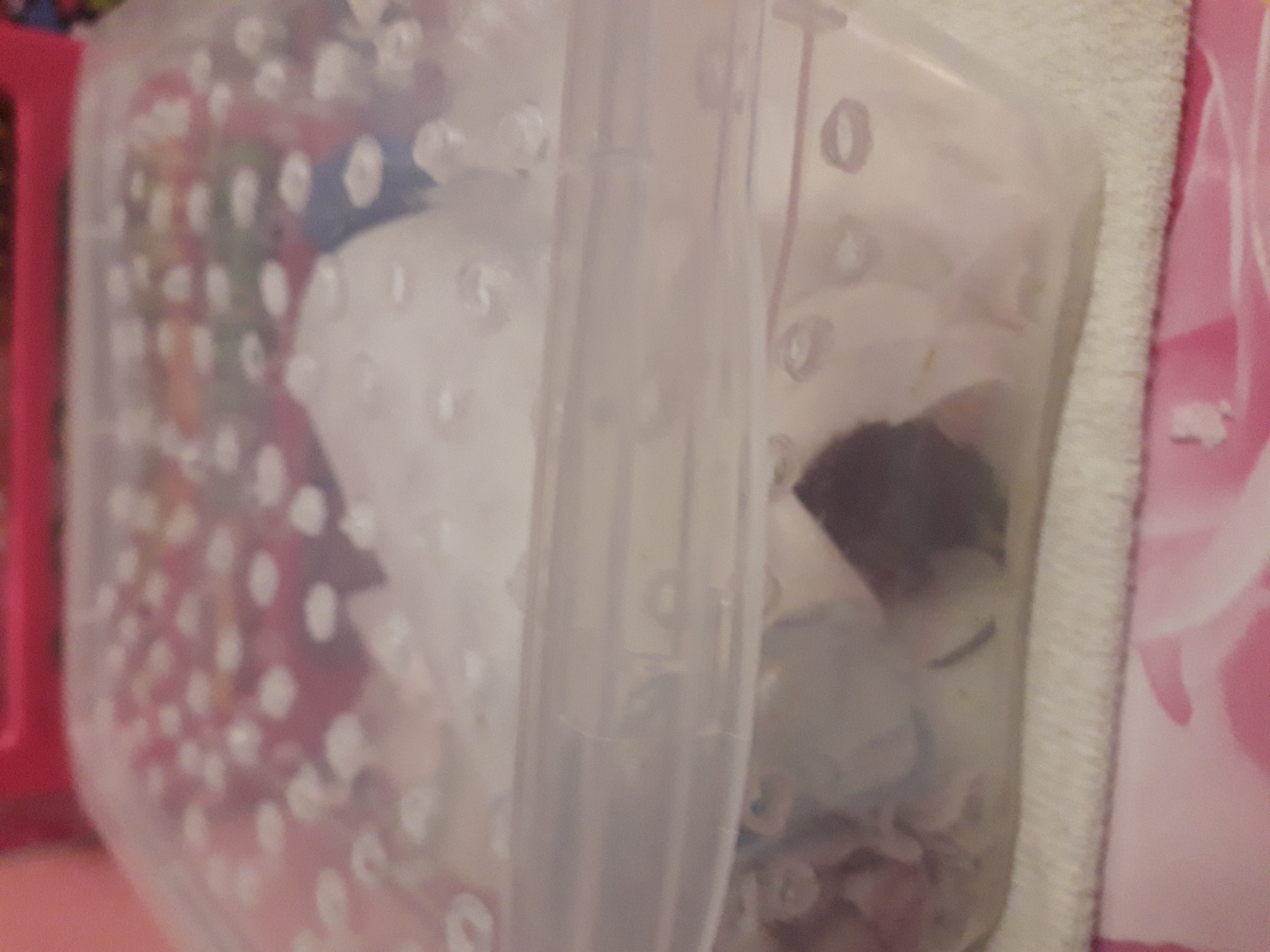 Я поняла насчёт обработки, спасибо, не будем ничего делать! Подскажите пожалуйста по содержанию: как долго ей бутылку с тёплой водой класть? Если она 2 дня назад глазки открыла, то ей примерно 2 недели? Спит вплотную к тёплой бутылке... и какие аппартаменты мышке нужны? В любой клетке пролезет между прутьев? У меня грызунов не было, кроме хомячка в детстве (он в клетке жил). Сейчас мышка в контейнере, где сделано много дырочек в крышке и вверху по всему периметру. Размером 16×12 см всего, плюс бутылочка с водой по диагонали...